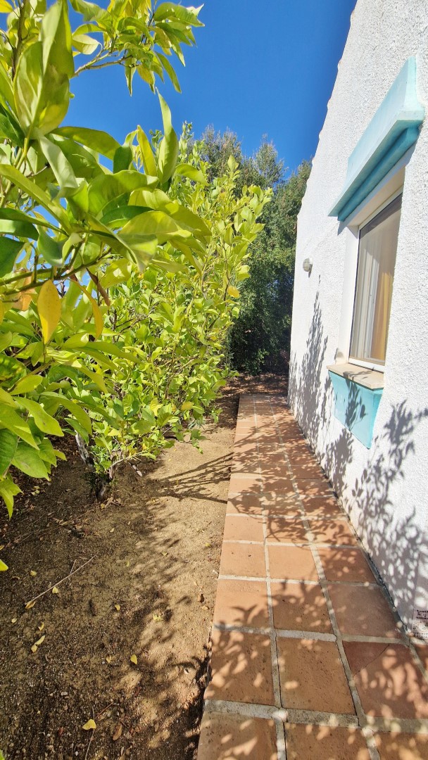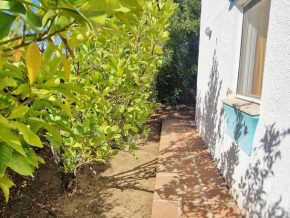 The secure, metal garden gate leads down a few steps into the garden, with the 8 x 4m pool visible immediately from, the gate, with lovely views over the countryside beyond the south hedge/boundary. The main section of garden is to the front of the house, (facing East and South) with the pool in the centre and flowering hedges and bushes around the borders. To the South side is a paved barbecue area with built-in barbecue and a rear door into the living room. To the West side is a garden with a beautiful olive tree providing shade and access to a small store room. There is room in this area to potentially create a drive for off-street parking. There are many tropical plants throughout the garden, including mature orange trees, lemon trees, almond trees and grape vines.