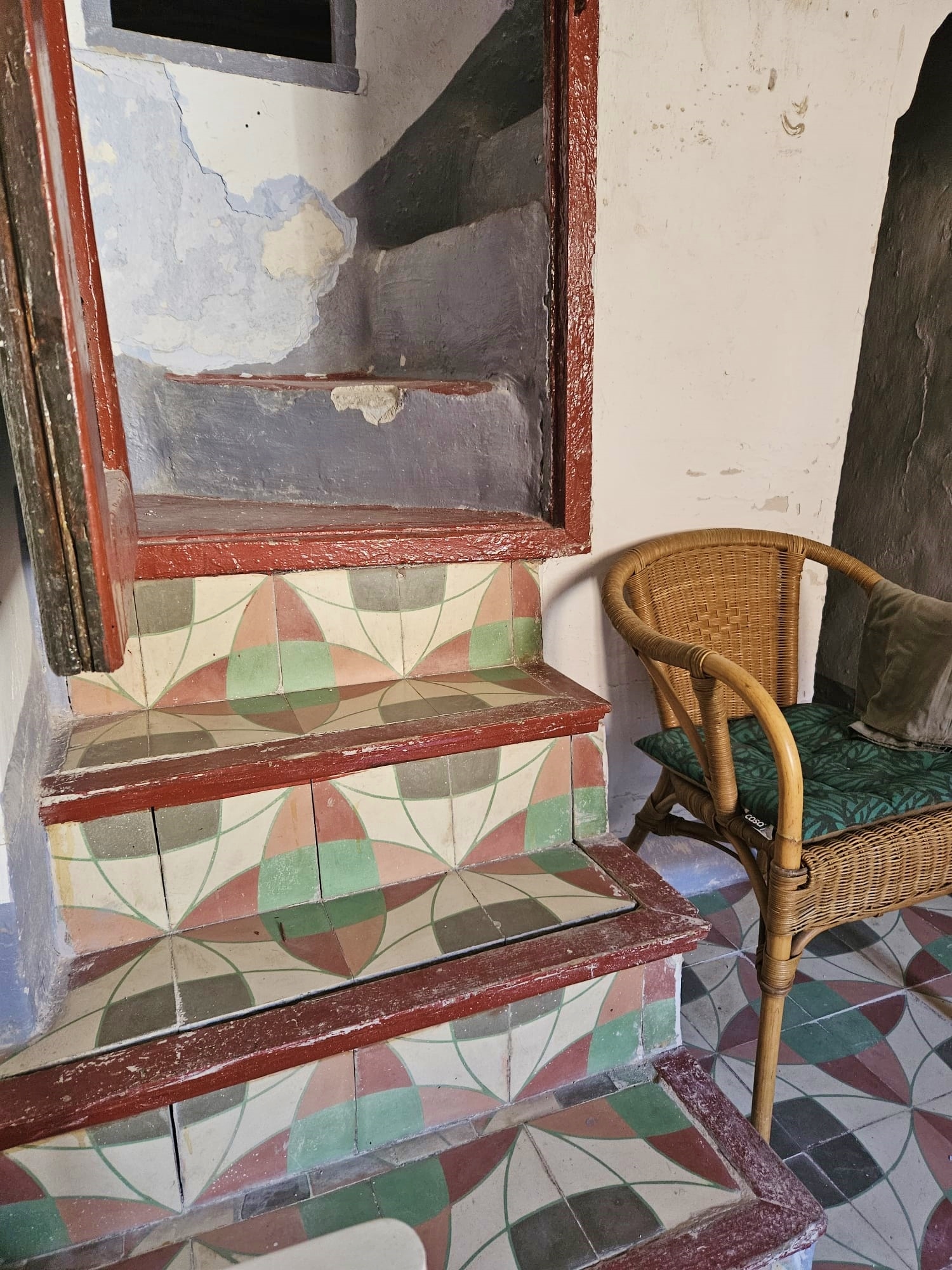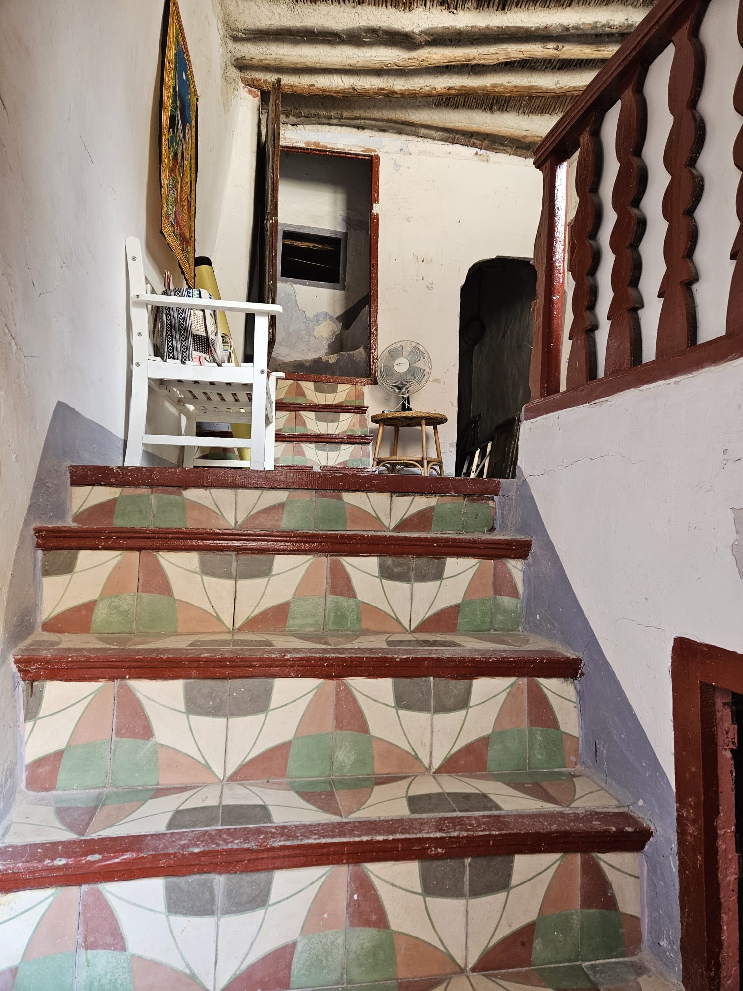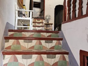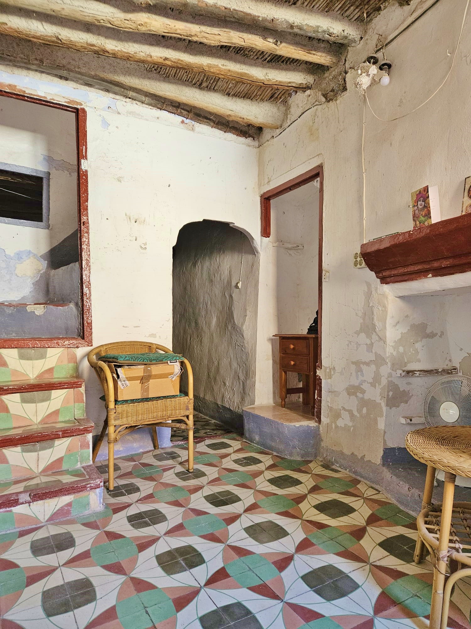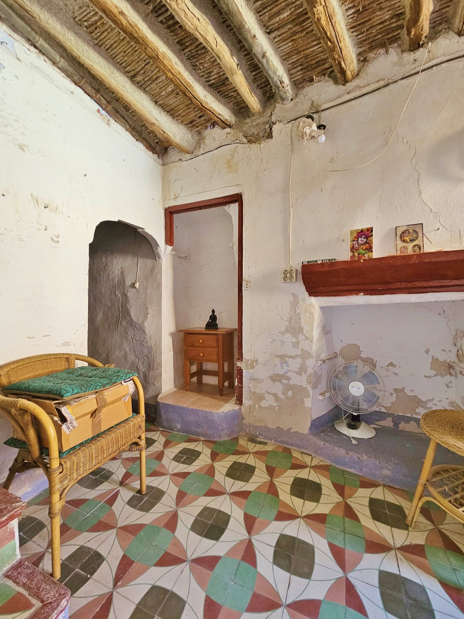Casa Radha still has its original, bright, coloured floor tiles and ceilings with original beams and cane features, as well as thick walls and ancient wooden doors and windows.  The house needs renovation, but the structure is sound.