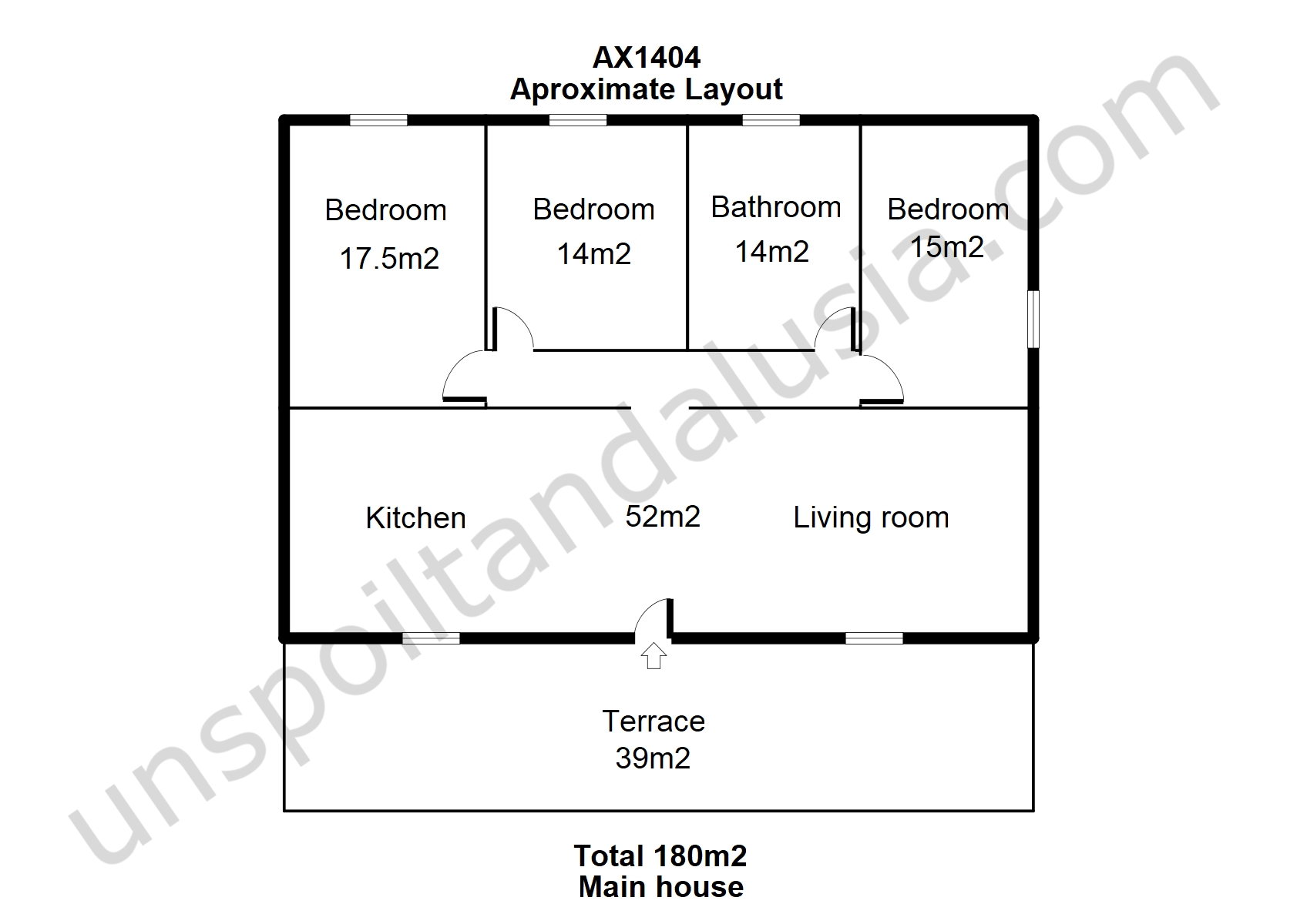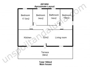 The main house has a large terrace (40m2) which is ideal for outdoor living, and for enjoying the wonderful views. The front door leads into a spacious living and dining room which is open plan to the kitchen, total space around 13 x 4m, with a corner fireplace. A central arch to the rear leads to a short passage to the three spacious bedrooms (5 x 3.5m, 4 x 3.5m and 5 x 3m) and a large bathroom (4 x 3m). Steps to the outside of the house lead up to a large roof terrace over the entire house, with fabulous views.