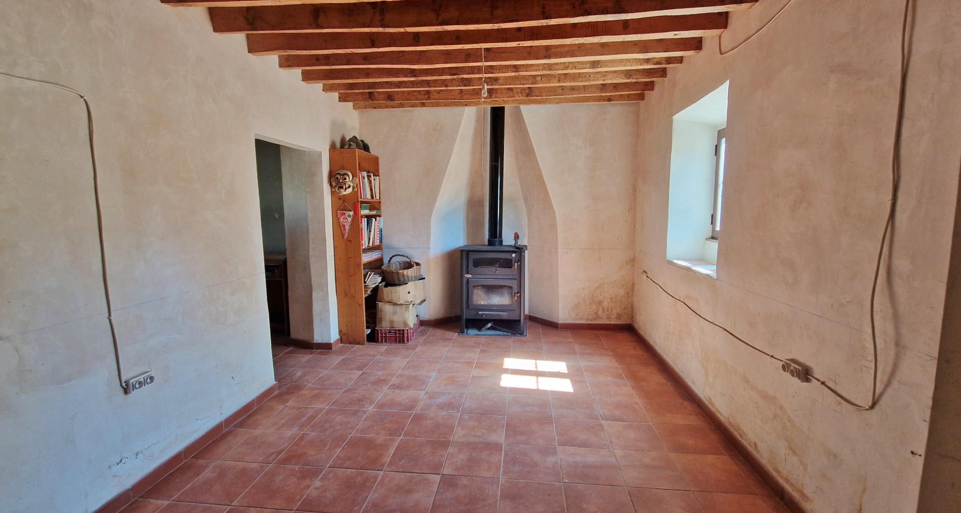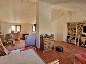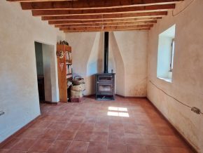 This house is on a quiet street within the hamlet.  It has been semi renovated, with plenty of love and character.  The front door leads into a large room with beams and a log burner, which is open plan to a second room, perhaps a dining room or kitchen.  Beyond is a conservatory type area with access to a modern bathroom.  Doors lead out onto a private garden.