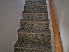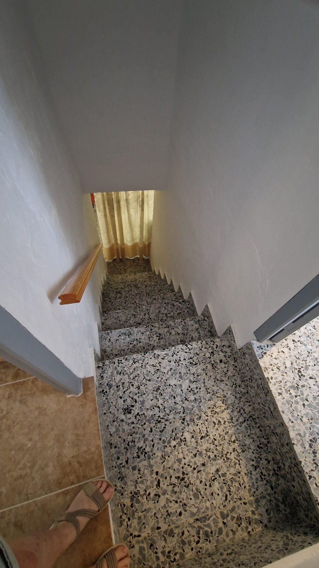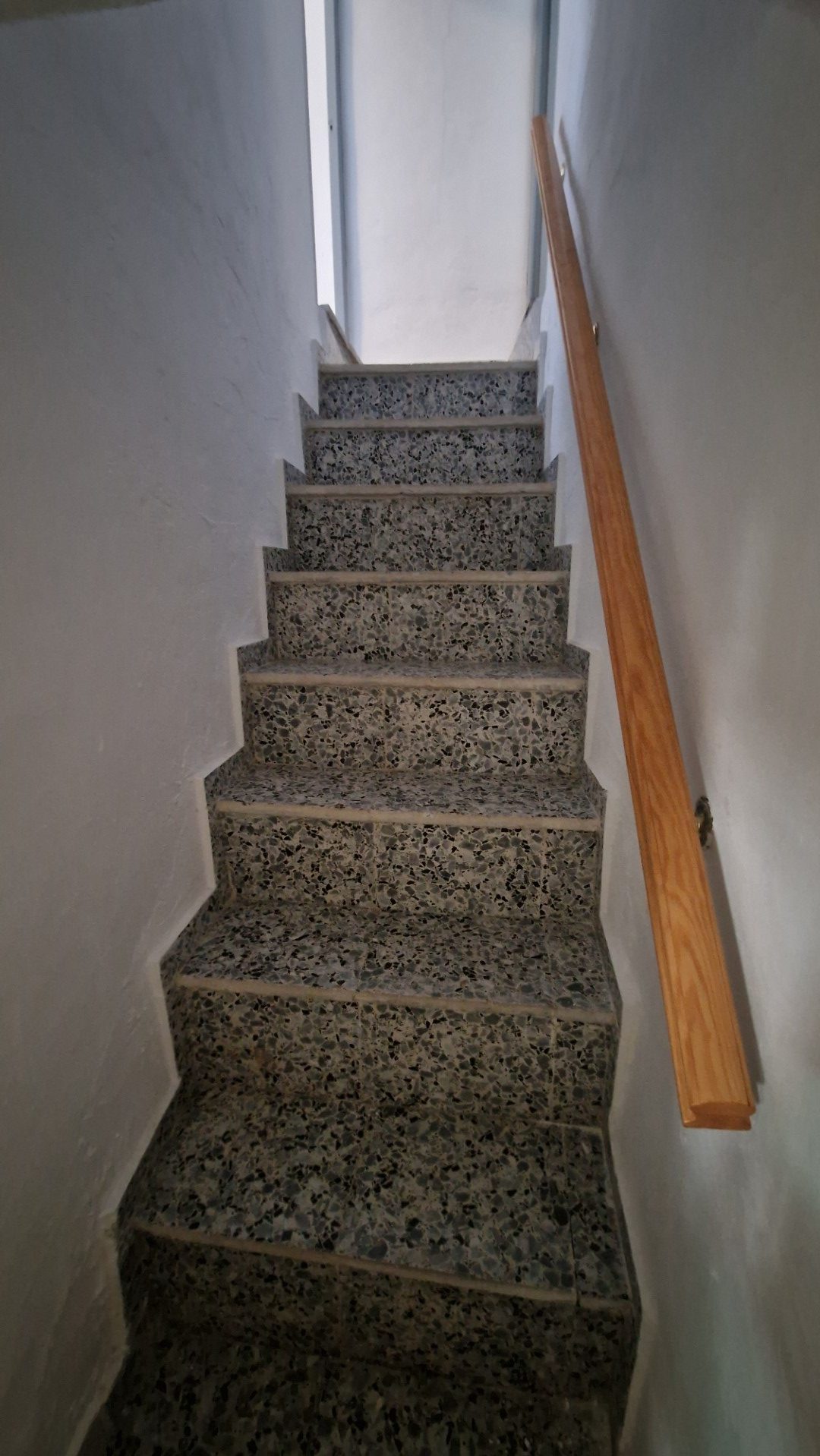Downstairs, the front door leads into a cosy living room with a fireplace for winter evenings.  From here is access to the downstairs bedroom (with a window out to a neighbouring patio), a small kitchen, laundry area, bathroom and a door out to the courtyard patio (around 10m2).