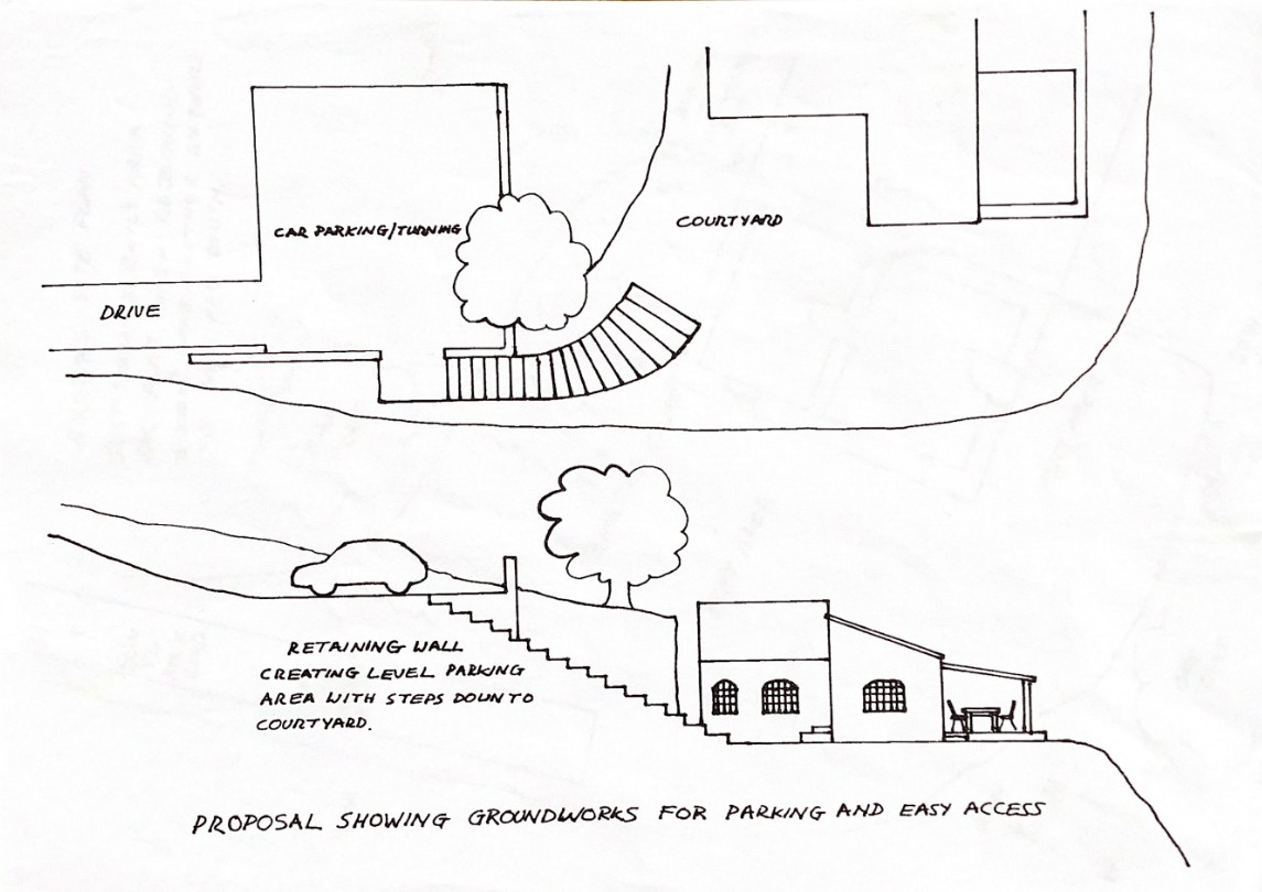 Access is off a very pretty, winding country lane (concrete and asphalt) below the village, with a very steep, but very short concrete access drive to the house.  As the access is fairly steep, it could potentially be improved by creating a parking and turning area above the house, with a few steps or a path down to the house, and even potentially adding a small bend to the drive, to reduce the incline.