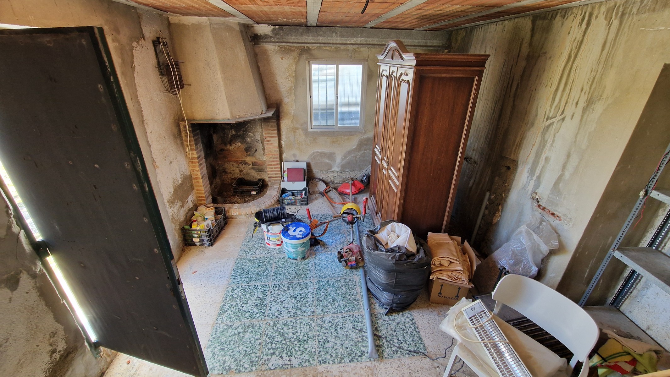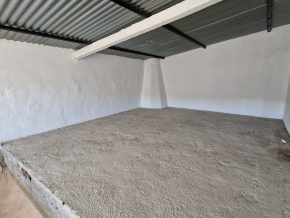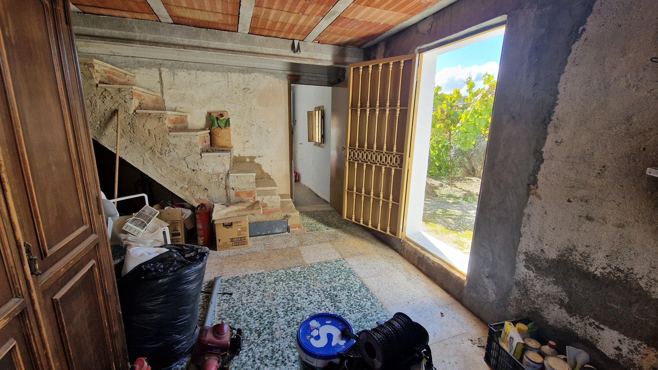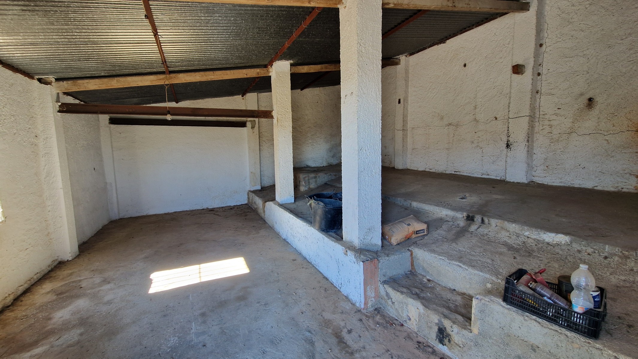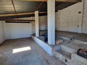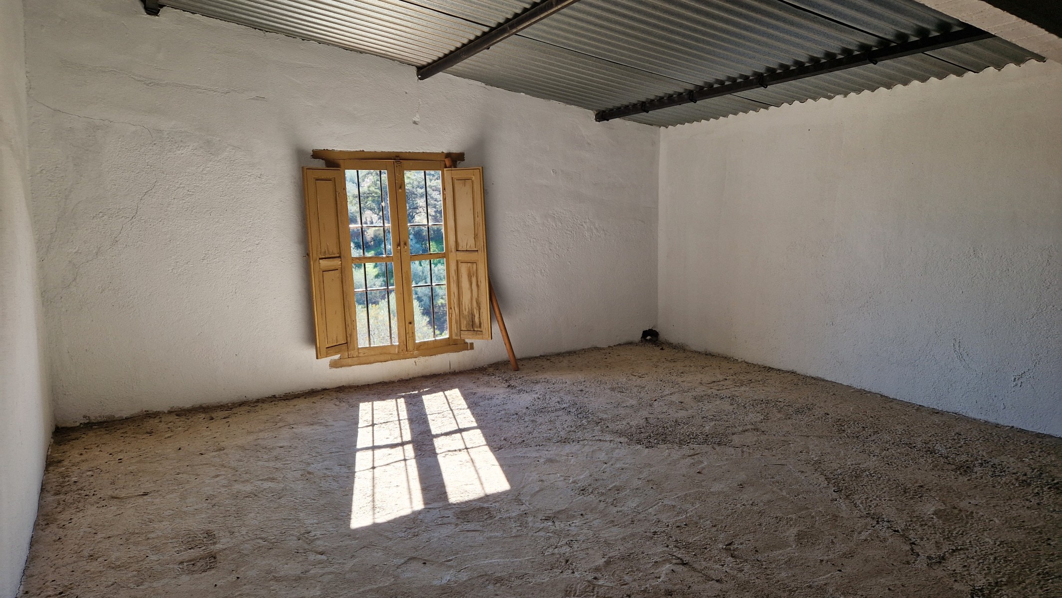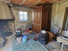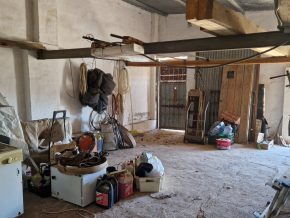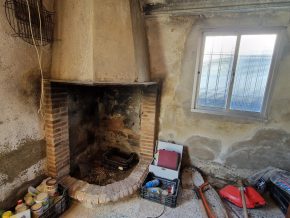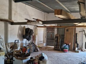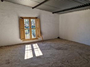 Back downstairs, to the left of the living room, through the bathroom, is a door leading to the annexe area, still to be renovated, with a short corridor leading into a room with a fireplace and a door leading outside to the side of the house. From this room a concrete staircase (the second staircase) leads to two upstairs areas (3 x 3 and 4 x 3m). Here the roof is corrugated iron and could be raised slightly and rebuilt, to create better headroom upstairs. This area could then be used as a separate annexe with a living room/kitchen, 2 bedrooms, plus a bathroom where the current corridor is located.