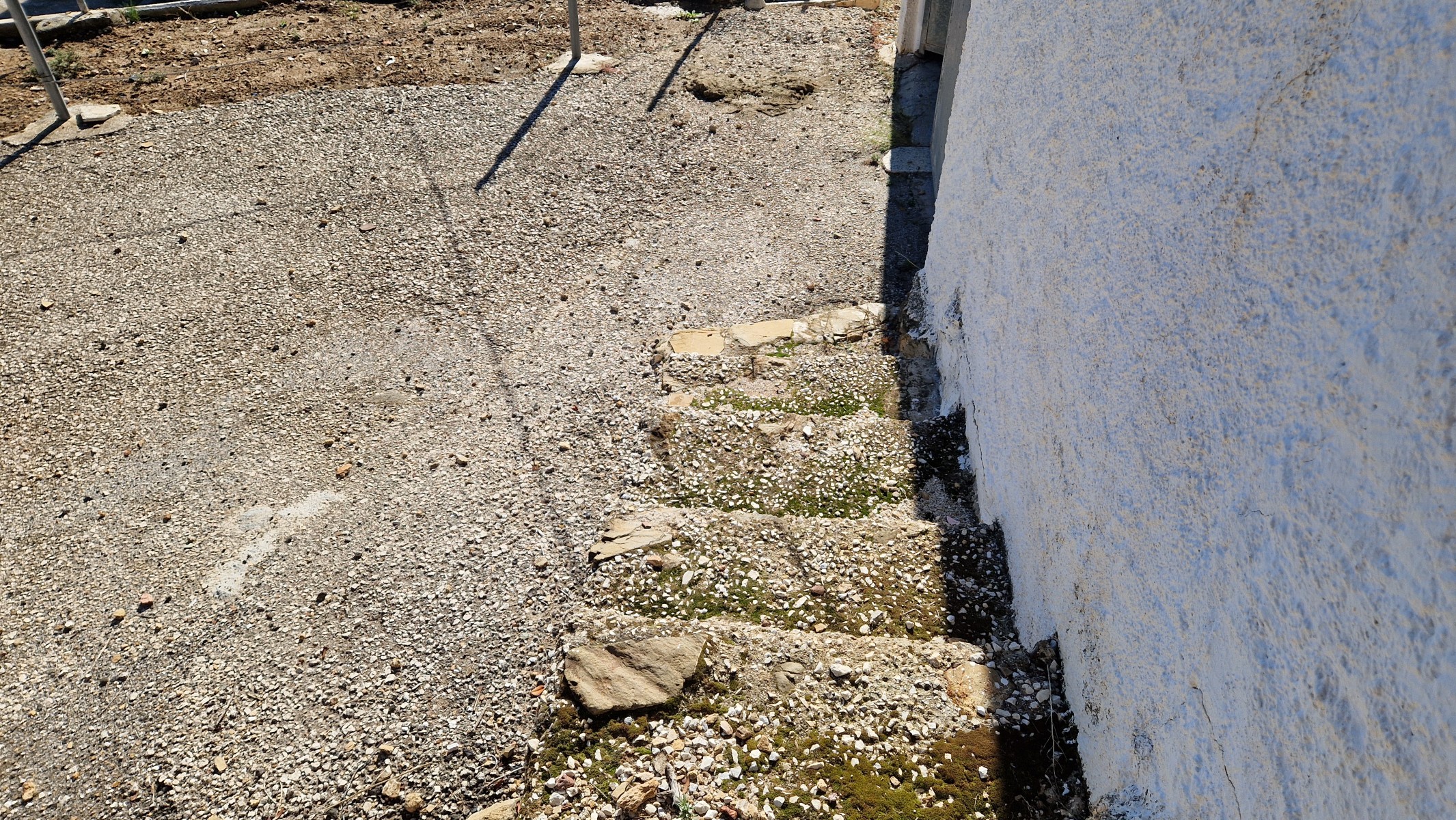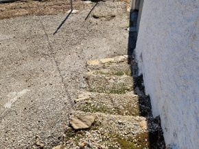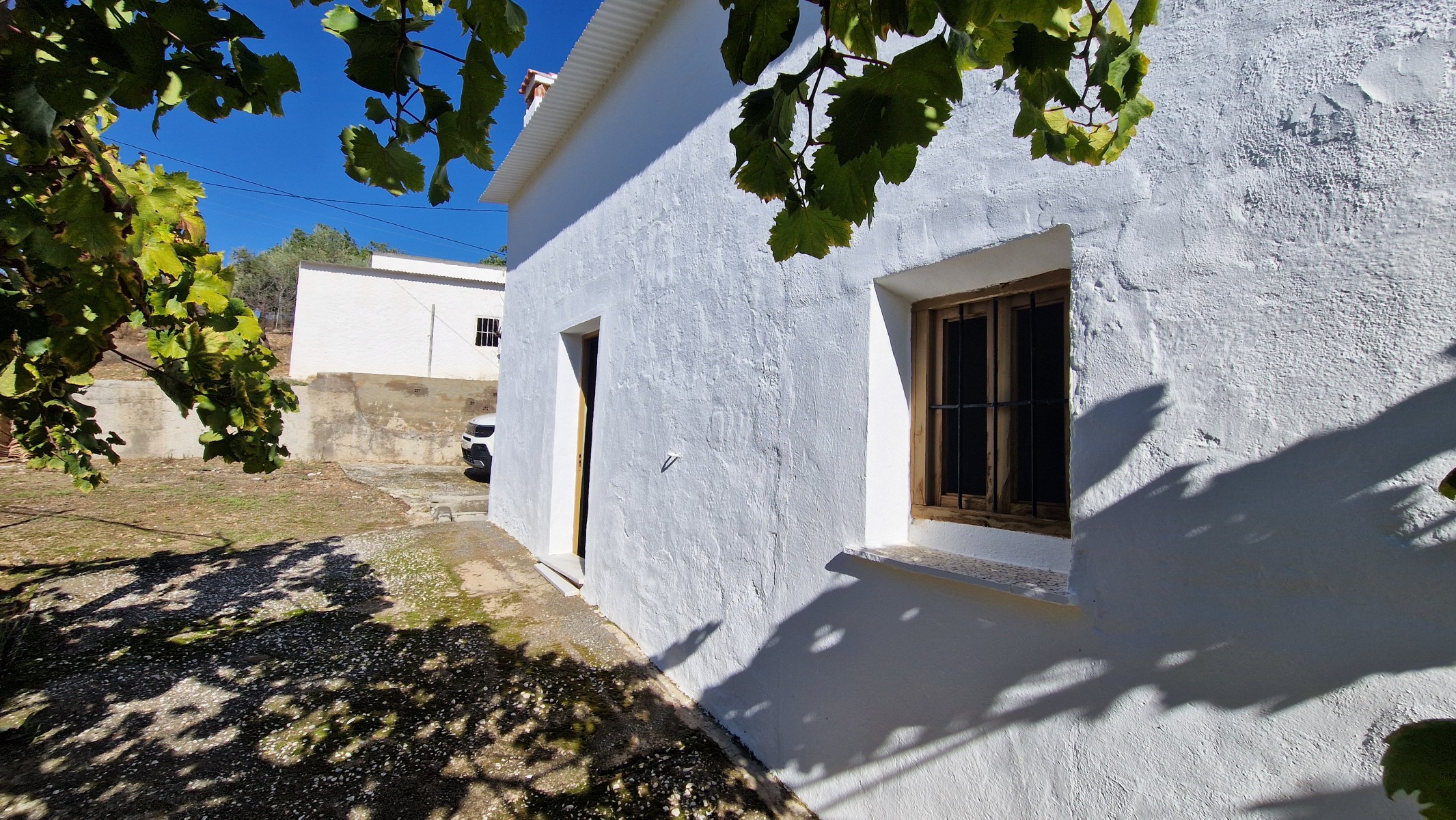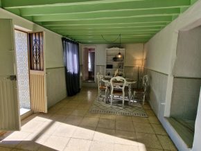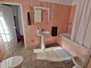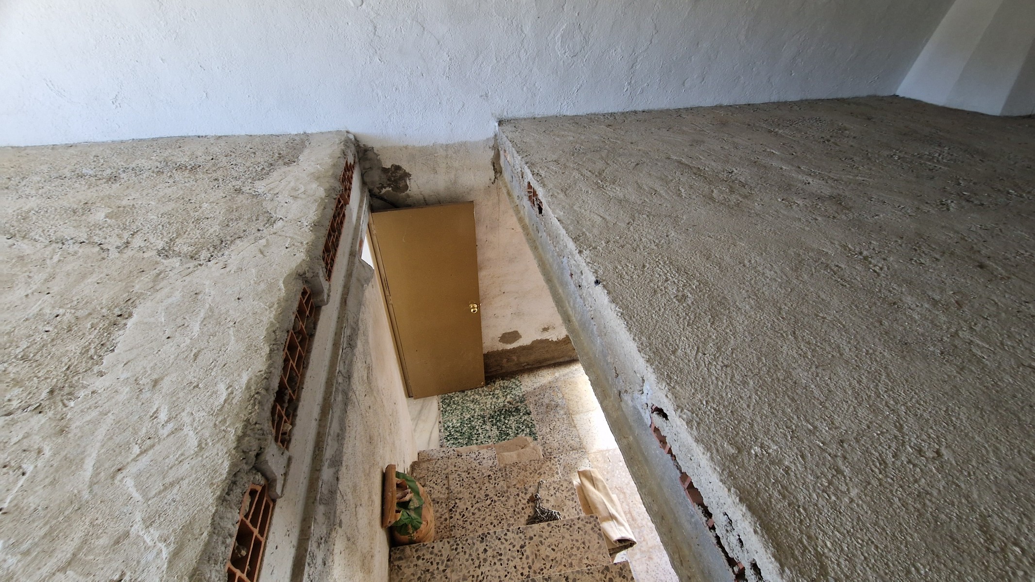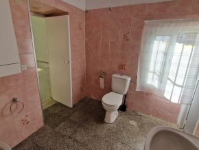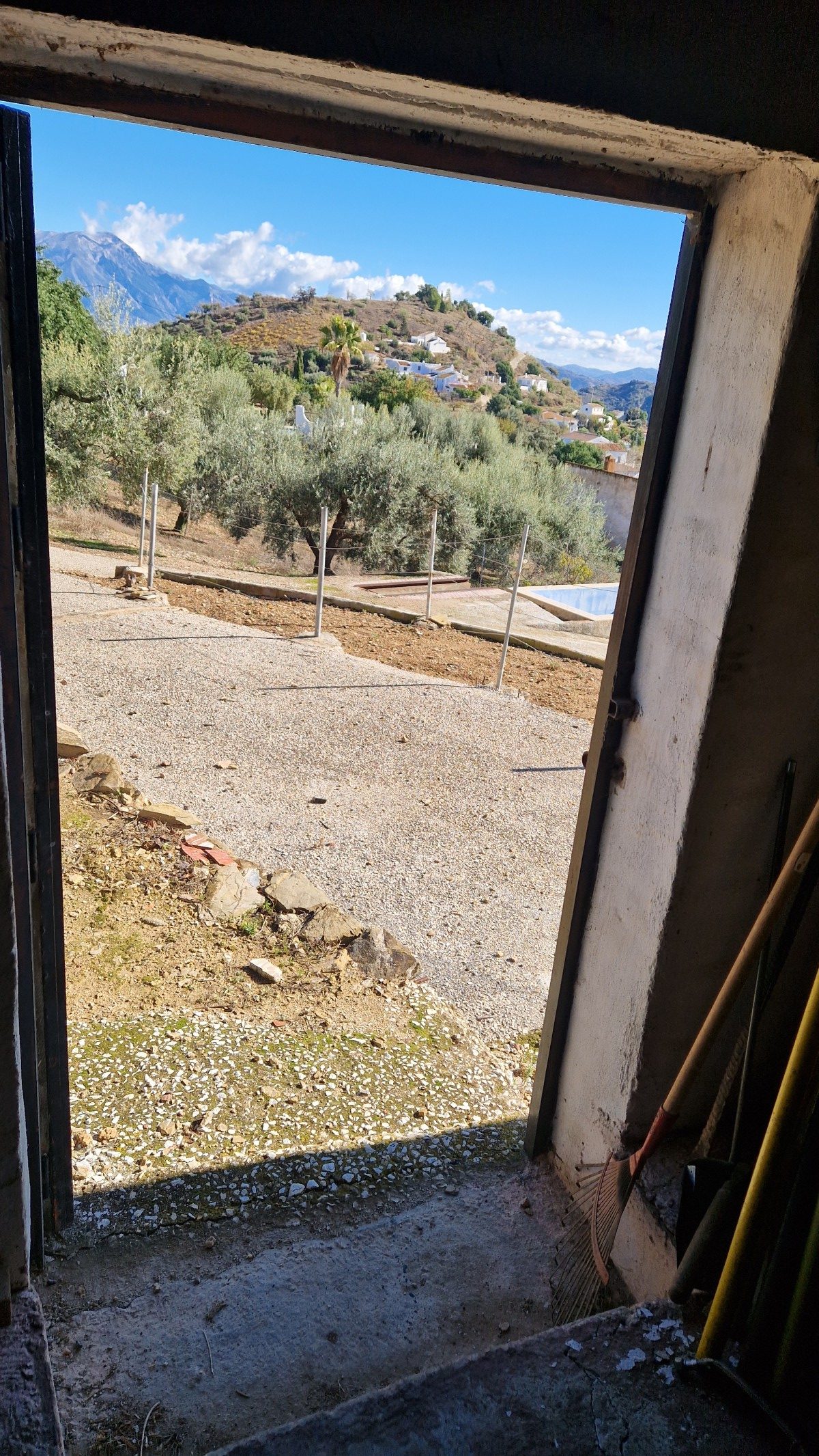 Back downstairs, to the left of the living room, through the bathroom, is a door leading to the annexe area, still to be renovated, with a short corridor leading into a room with a fireplace and a door leading outside to the side of the house. From this room a concrete staircase (the second staircase) leads to two upstairs areas (3 x 3 and 4 x 3m). Here the roof is corrugated iron and could be raised slightly and rebuilt, to create better headroom upstairs. This area could then be used as a separate annexe with a living room/kitchen, 2 bedrooms, plus a bathroom where the current corridor is located.