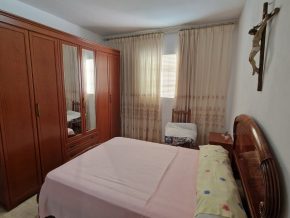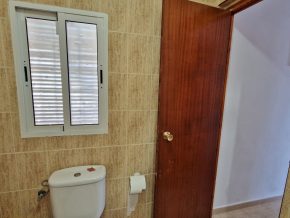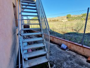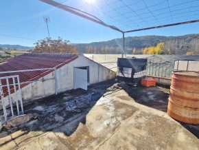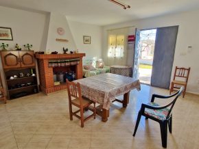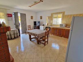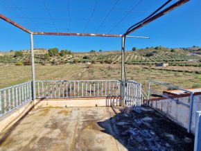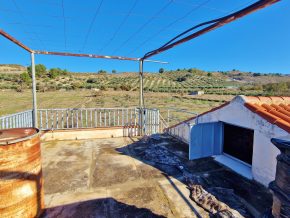 The building consists of two bedrooms, one bathroom and a large, open plan kitchen/dining/living room, with a traditional, large open fireplace for the winter. However, adjoining on one side is a large garage/workshop that might be ideal for extension of the house. This area is around 9 x 5m, with garage doors and a pedestrian door to the front, and a door to the rear. The rear door leads out onto a small rear patio, and from here, steps lead up to a roof terrace with lovely views over the ‘vega’ valley, and out the mountains beyond.