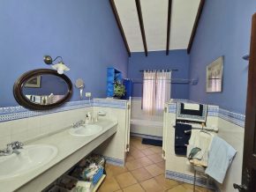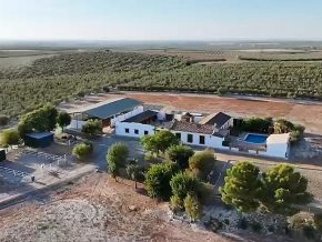 The entire finca is fenced and a gated entrance leads across the land to the main car park, where we find the magnificent entrance to a walled courtyard. This contains the beautiful pool, (53m2), the casita, (76m2), separate outdoor bathroom for the casita and the pool, a beautiful main house, (197m2), five stables, and a bar/dining area. There is also a huge open air paddock and training ground and an equally large covered paddock or picadero (500m2). There are also two barns (47m2 each), and several store rooms/tack room, as well as flat land around the buidings and views across the countryside of olive groves and sunflower fields.