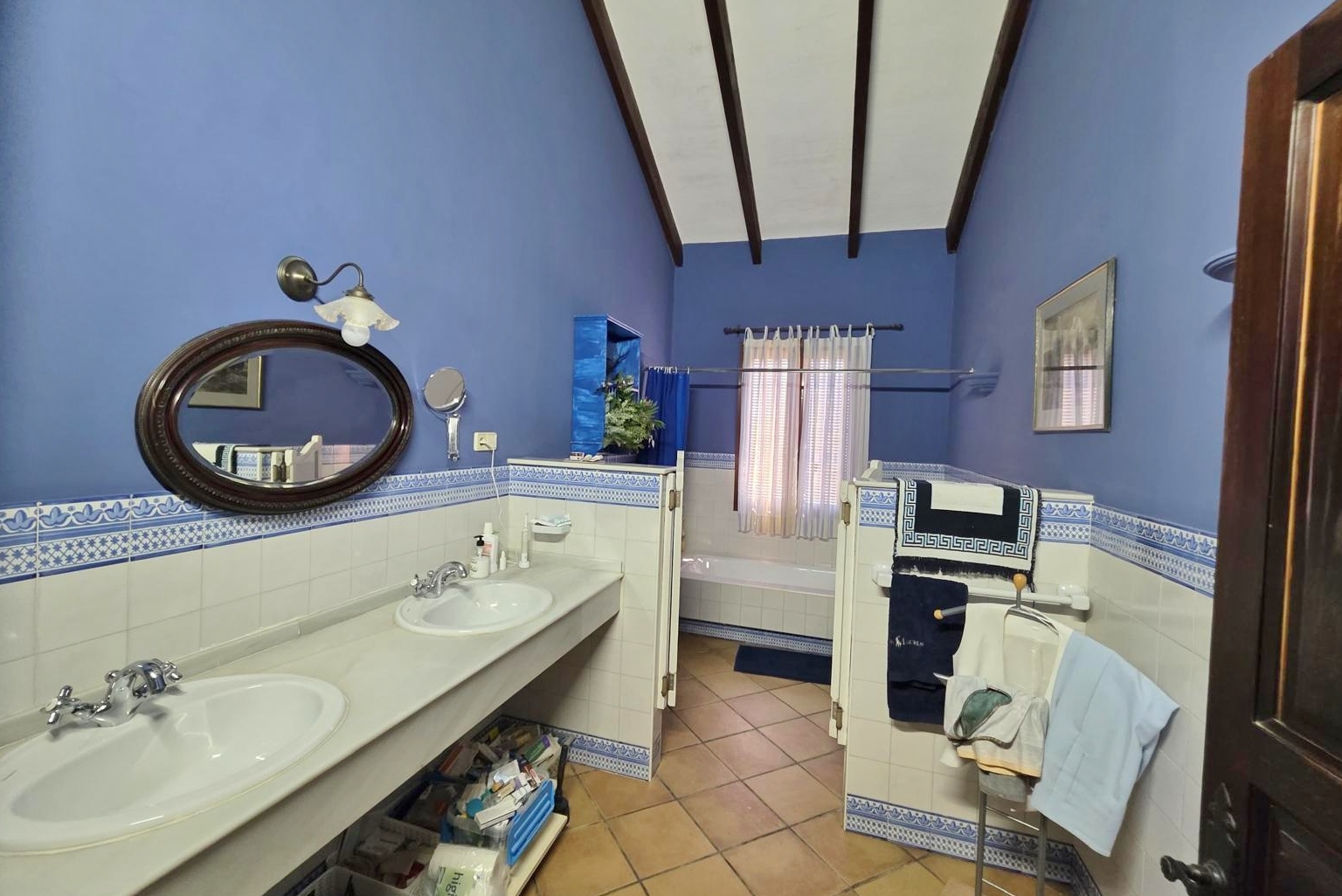 The entire finca is fenced and a gated entrance leads across the land to the main car park, where we find the magnificent entrance to a walled courtyard. This contains the beautiful pool, (53m2), the casita, (76m2), separate outdoor bathroom for the casita and the pool, a beautiful main house, (197m2), five stables, and a bar/dining area. There is also a huge open air paddock and training ground and an equally large covered paddock or picadero (500m2). There are also two barns (47m2 each), and several store rooms/tack room, as well as flat land around the buidings and views across the countryside of olive groves and sunflower fields.