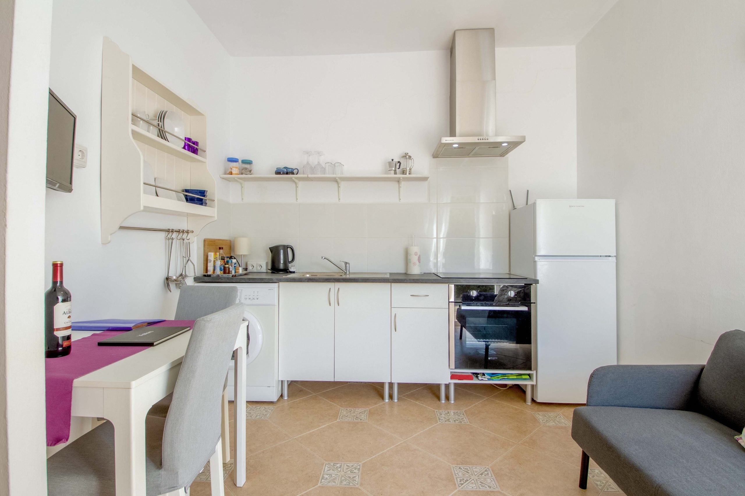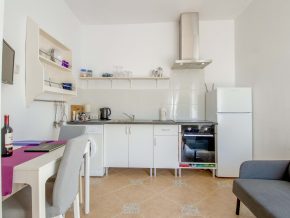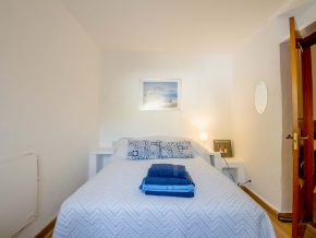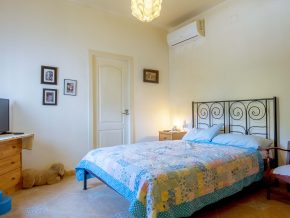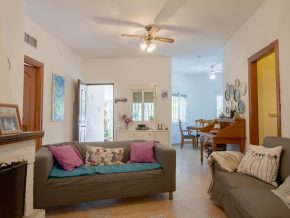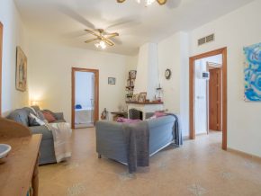 The main residence features two bright bedrooms, a well-appointed bathroom, and a light-filled kitchen that flows into a cozy living room anchored by a traditional fireplace. At the entrance, a charming sunroom serves as a versatile space to soak in the morning light, leading into an interior kept perfectly comfortable year-round by air conditioning, central heating, and the refined luxury of underfloor heating.