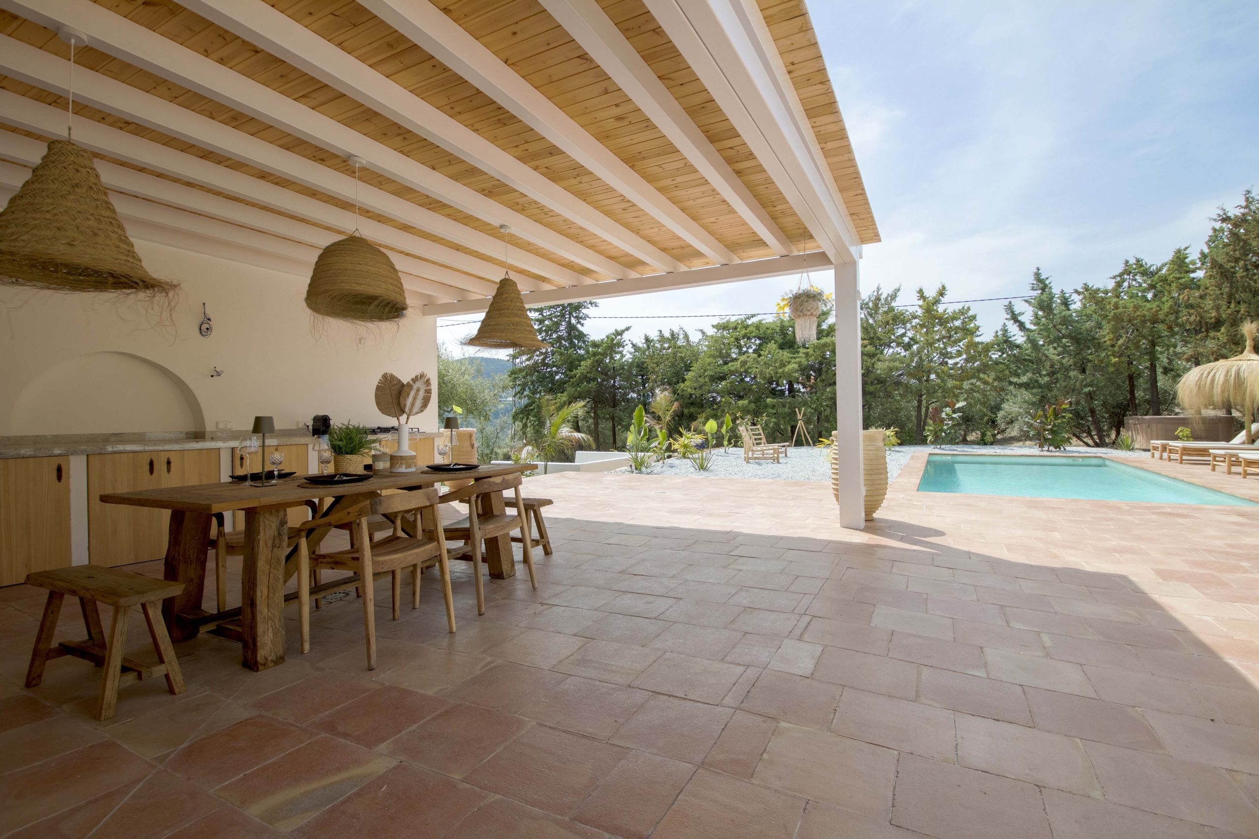 – Large private swimming pool and fully equipped outdoor kitchen – Multiple terraces, electric entrance gate, and carport