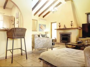 The experience of the home begins at the spacious covered terrace, an arched entrance that serves as a tranquil outdoor lounge for enjoying the mild climate. Moving inside, the center of the villa reveals an inviting living room characterized by high vaulted ceilings with exposed wooden beams and a cozy wood-burning stove, creating a warm atmosphere for gatherings. The modern kitchen is thoughtfully positioned for easy access to the living area, ensuring that whoever is cooking remains part of the social heart of the home. The ground floor accommodates three well-appointed bedrooms, including a master suite with its own private bathroom, while a second large bathroom is conveniently located at the start of the hallway to serve the rest of the household. It stands as a meticulously maintained haven, where lush Mediterranean gardens and a private pool create an idyllic backdrop for a serene lifestyle in the heart of nature.