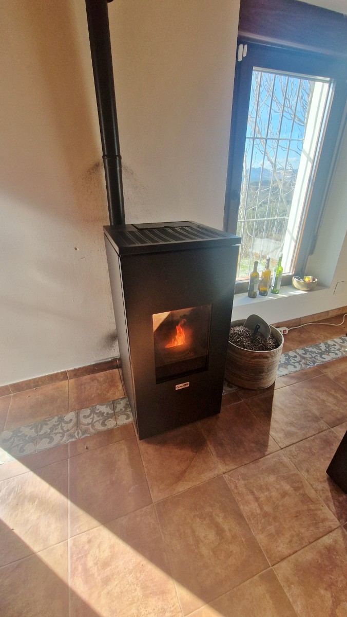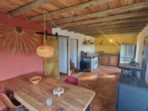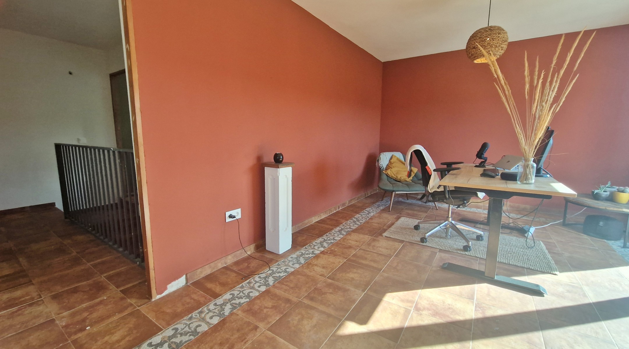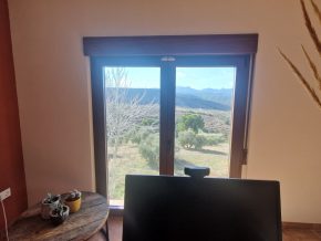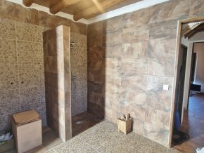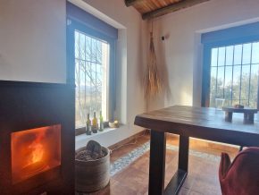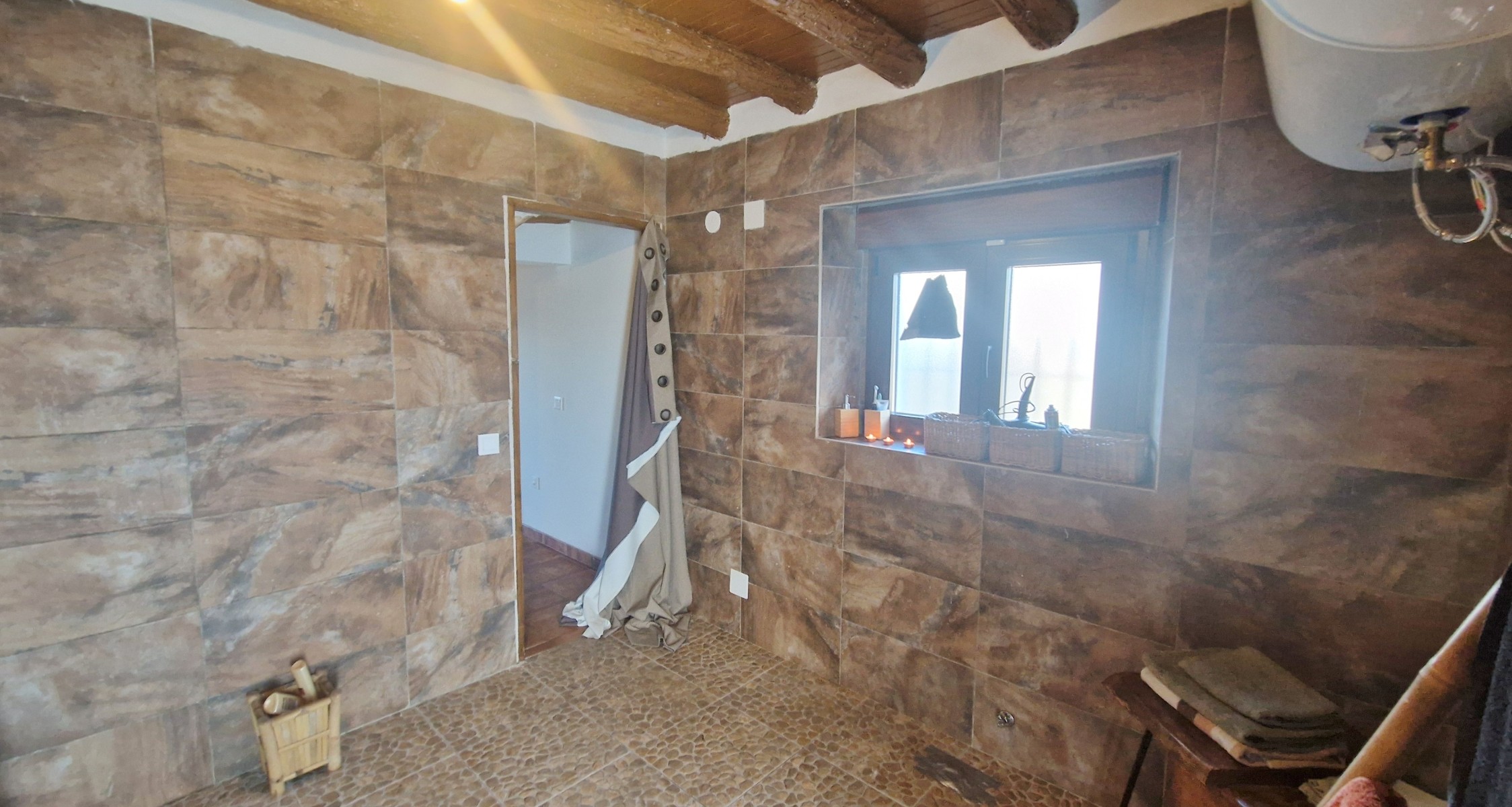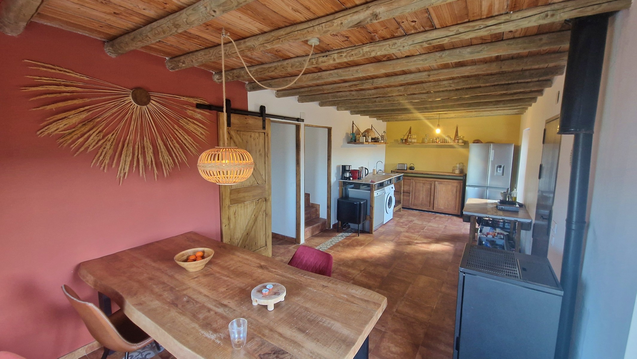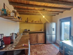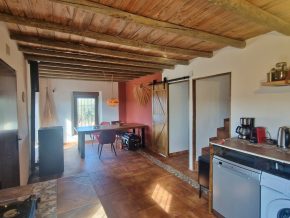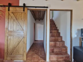 The cortijo is reached via a private driveway from the road, leading to a large parking area, and no dirt track. The house has a flat terrace to the front (potential to add a cover or an awning for protection from the sun in the summer) and the area just below the terrace drops down slighty, making it potentially the ideal place for an above ground pool placed on the ground at a lower level, with one side level with the terrace. From the terrace, the front door leads into a delightful living space. This room (8.2 x 3.3m) has beams and wood infill detail on the ceilings on the ground floor and rustic floor tiles throughout. It is divided into two parts: the living room area, with a modern, efficient pellet stove, and a kitchen/dining area. The windows, all recently replaced, are double glazed and hermetically sealing, with magnificent views from each.