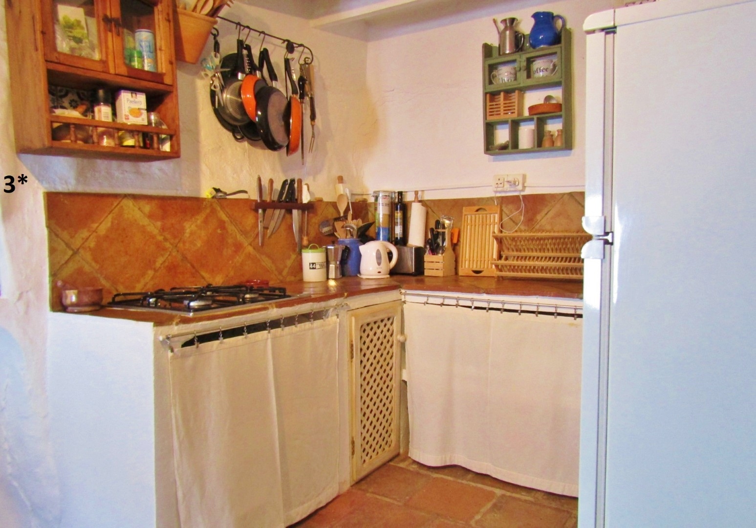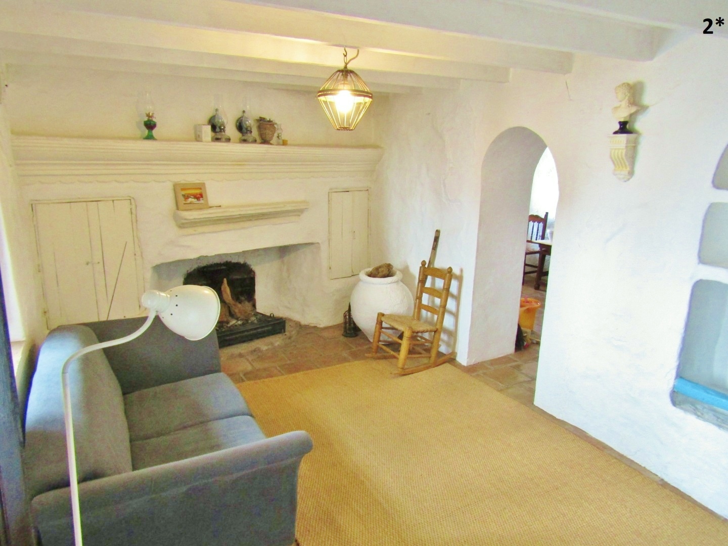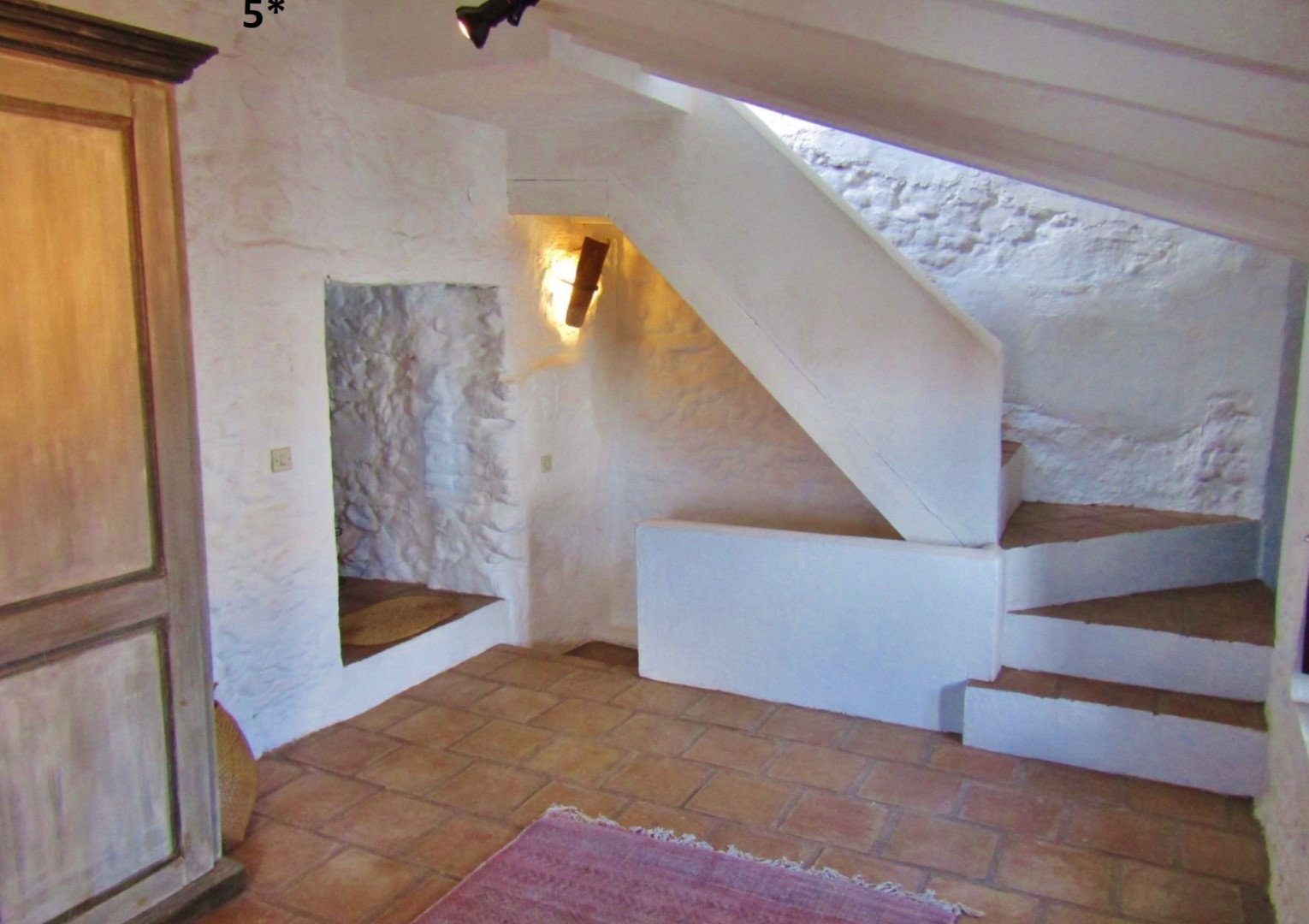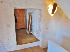 A pretty little front terrace and porch is where we find the entrance to the property. The front door leads into a living room which has beams, a traditional fireplace and terracotta original floor tiles, with an arch through a remarkably thick wall into the dining room, with one step up to the fully fitted, cottage style kitchen . There is a quite unique bathroom, located off the living room, by the staircase, which has rock for walls, giving it a cave-like feel, with a window.