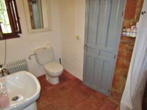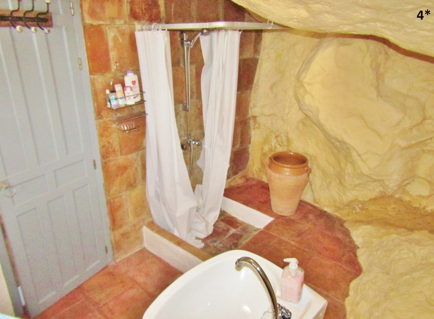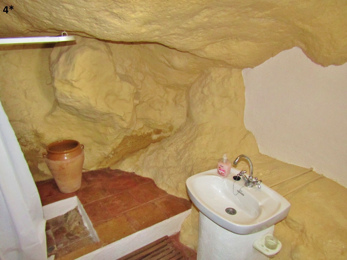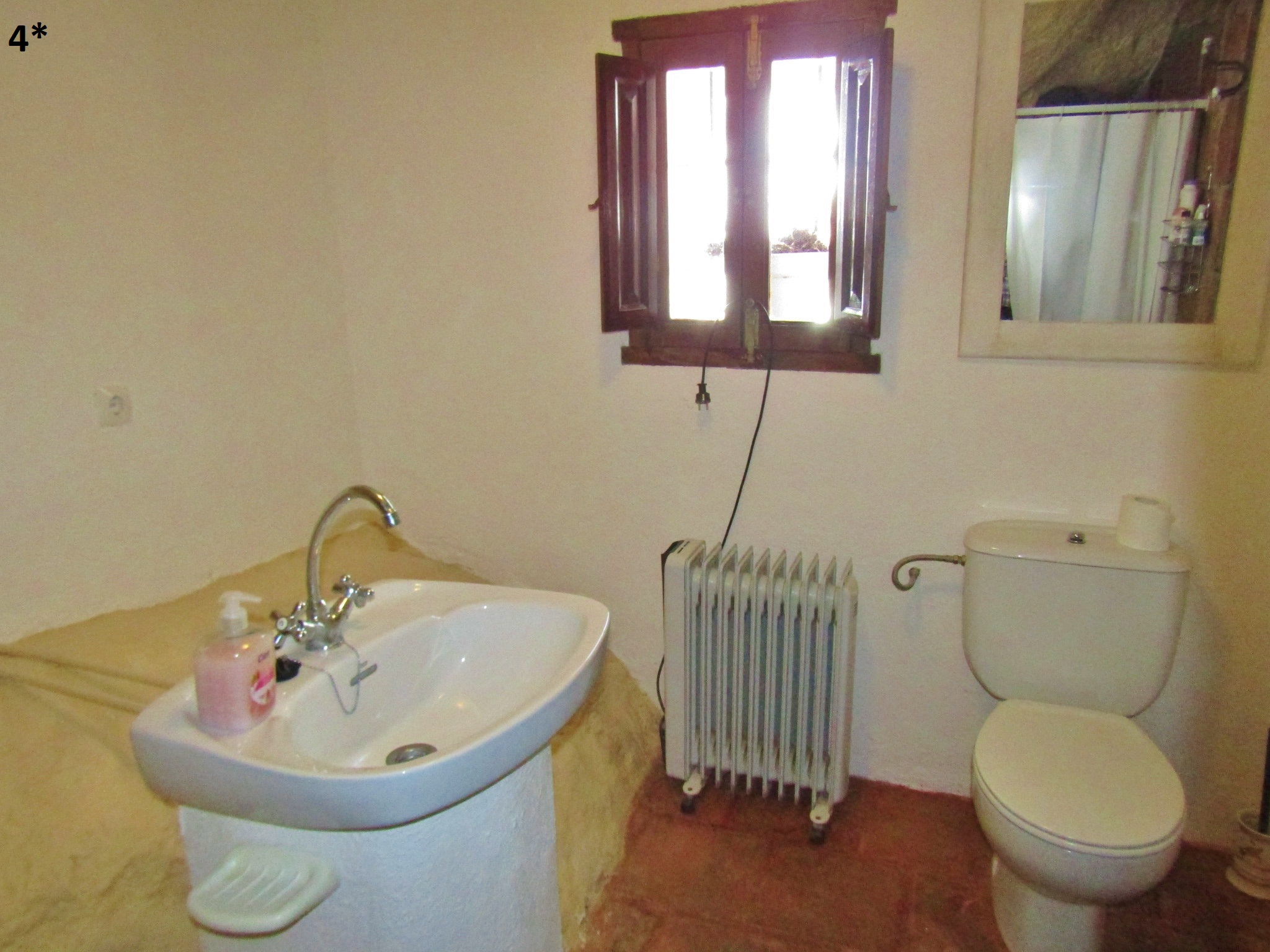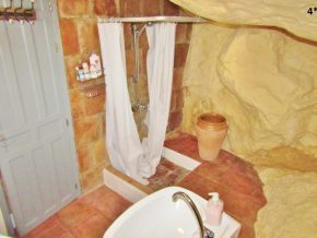 A pretty little front terrace and porch is where we find the entrance to the property. The front door leads into a living room which has beams, a traditional fireplace and terracotta original floor tiles, with an arch through a remarkably thick wall into the dining room, with one step up to the fully fitted, cottage style kitchen . There is a quite unique bathroom, located off the living room, by the staircase, which has rock for walls, giving it a cave-like feel, with a window.