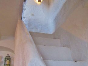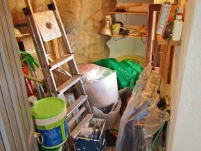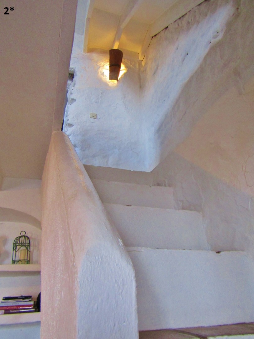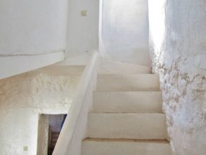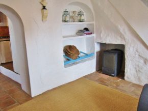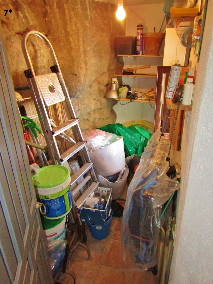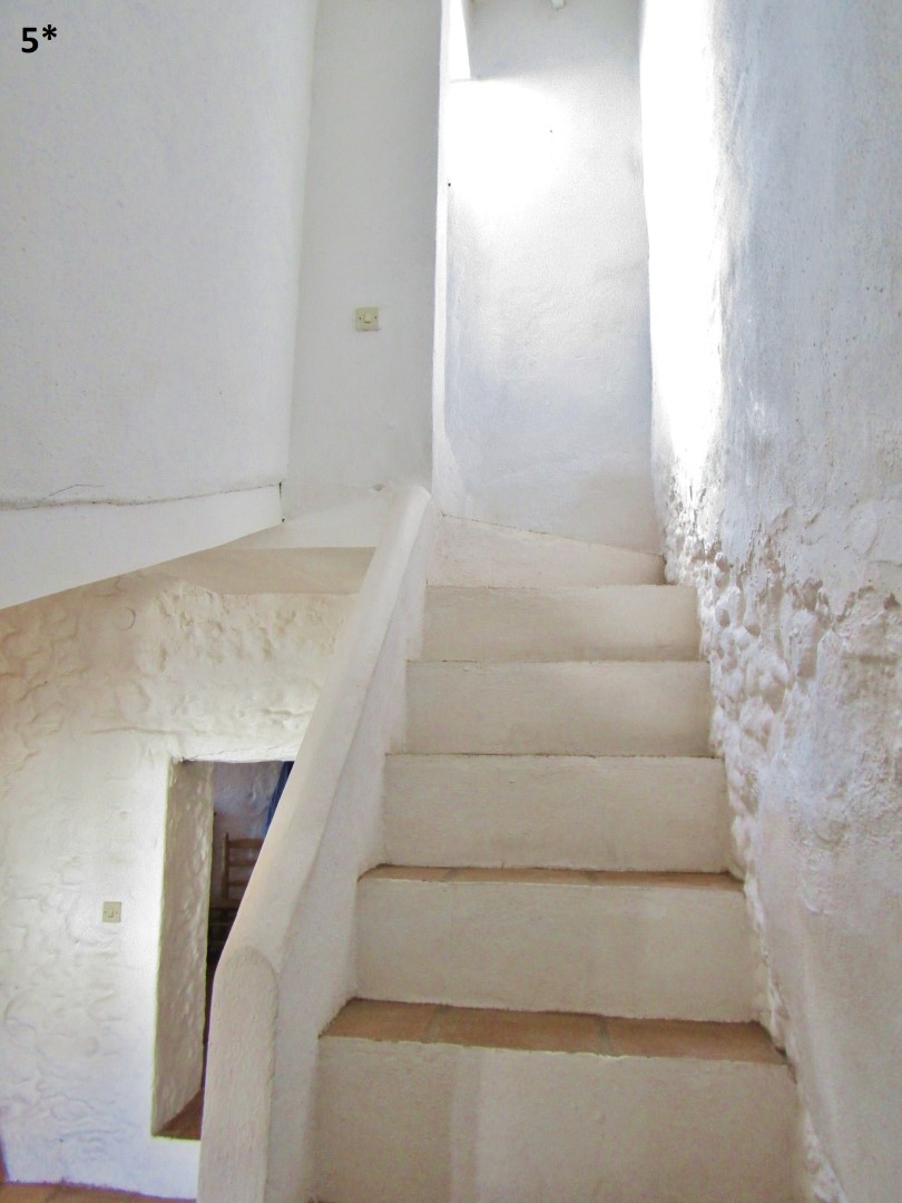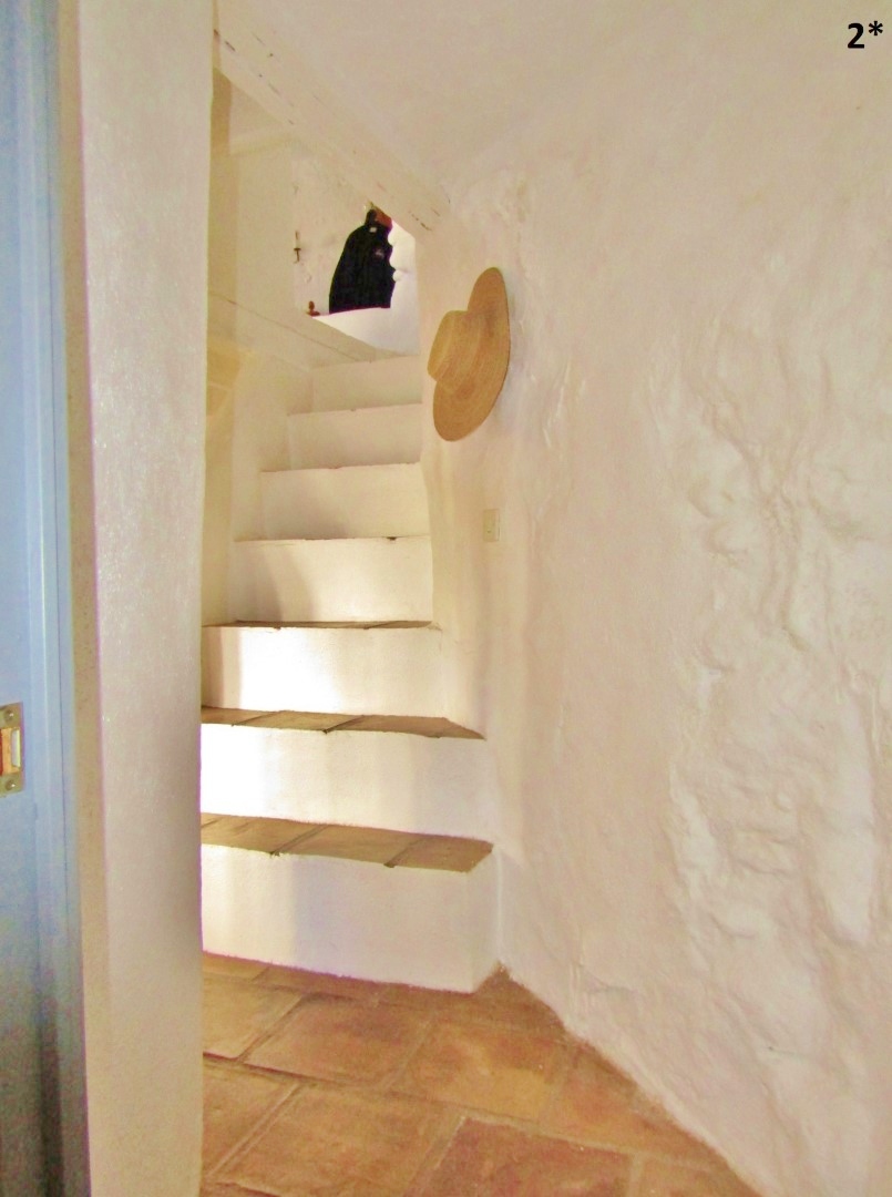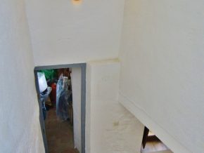 Stairs lead up to two rooms upstairs (to make the second bedroom private, a partition wall could be erected), and a useful store area. The second room has a low doorway, through a thick, stone wall.
