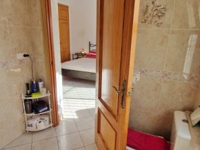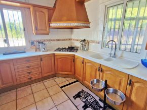 The house is laid out around the central patio, with a large living room (8 x 4.5m) with corner fireplace and plenty of windows, a spacious, fully fitted kitchen (4 x 3m) with an arched opening to the living room, and a useful utility room (3 x 2.5m). There are two good sized guest bedrooms (5 x 3m and 4 x 3m), a guest bathroom (3 x 2m), and a master bedroom (5 x 4m) with an ensuite bathroom (2 x 2m), plus a separate WC (2 x 1m). Beyond the utility room, to the rear side, are two additional rooms, currently used for storage. The first, (around 6 x 3m) is made up mainly of glass panelling, with large double entrance doors, and would make a perfect rear conservatory or even an ‘orangery’. Beyond is the large second store room (also around 6 x 3m), which also has access to an underground water deposit for extra water. This room could be used as a workshop, studio or even an indoor yoga area and gym.