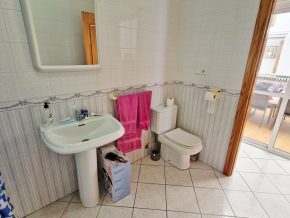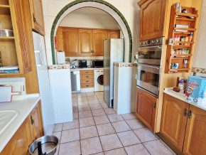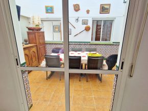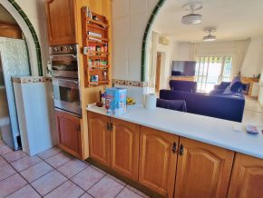 A gated entrance leads up a private driveway to a parking area to the West side of the house, and behind, on the north side too, with parking for at least 4 or 5 vehicles. The main house and pool are located on this level, elevated above the flat garden area, separating it perfectly from the lower grounds. To the front of the house, facing the pool is a covered terrace (around 2 x 10m) with arches, tile and pull-down awnings. The centre of this unusual house is taken up by an internal patio courtyard of around 5 x 4m, with windows all around, bringing in plenty of light from the centre of the house, as well as from the exterior windows of the house. Two doors, from the two opposite ends of the internal patio give access to its excellent space, used currently as a dining area. It could also be turned into an internal courtyard garden, with potted flowering plants, perhaps even a palm tree in the centre.