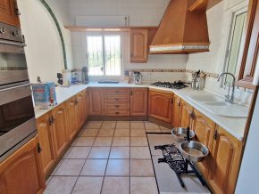 Situated just above the coast and just outside the village, the location is convenient and access is excellent. Its elevated position offers a panoramic view of the sea and countryside. This is a very rural area and there are fruit orchards and vegetable growing farms around, but this adds to the charm and reality of this lovely area. It is peaceful and quiet, and the house has the very best orientation for this part of the world: South-South East, allowing sunshine from dawn to dusk, but less of the intense heat of the sun as it sets in the West in the summertime. There are other neighbouring houses around, but the location is very private.
