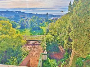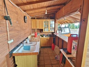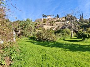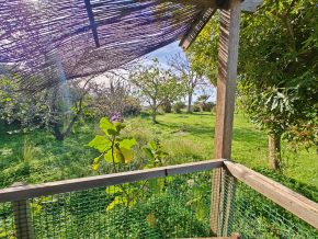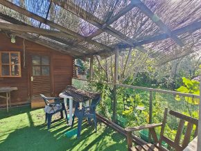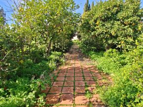From the terrace, steps lead down to the grounds on the lower level, which are on flat land, laid to natural grass which grows in the springtime and dies down in the summer naturally. The whole area is planted with mature trees of many types, including many fruit trees and decorative trees. It is a delight to wander through the grounds, enjoying the peace, the views and the space. Set to one side are the two wooden chalets, accessed via a beautiful walkway lined with citrus fruit trees. Each chalt offers a guest ‘studio’ or large bedroom with a covered terrace. Both need some updating/repairing and one of them needs renovation, but as they are registered buildings, it is well worth updating and maintaining them. At present there is a shared bathroom accessed from outside (currently out of action). It would be easy to incorporate private bathrooms into each chalet.