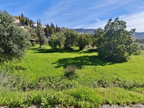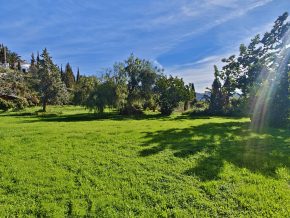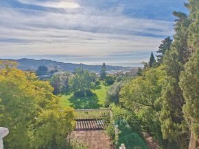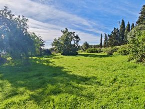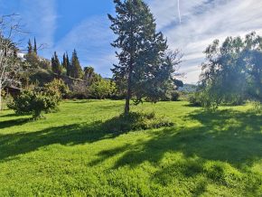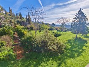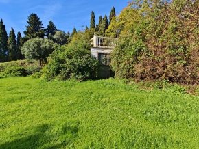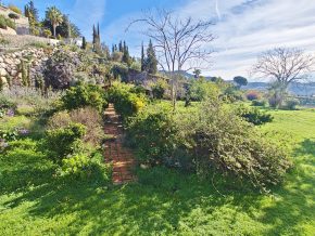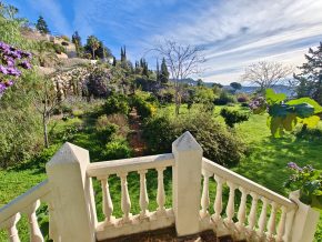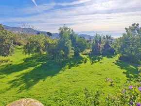 3 bedrooms – 2 bathrooms – separate WC – two huge adjoining storerooms – pool – two guest chalets in garden = 2 further bedrooms – extensive, flat gardens with many trees – 5000m2 plot – stunning, panoramic sea views – excellent access – 1.5km to the village – 5 Kms to the beach