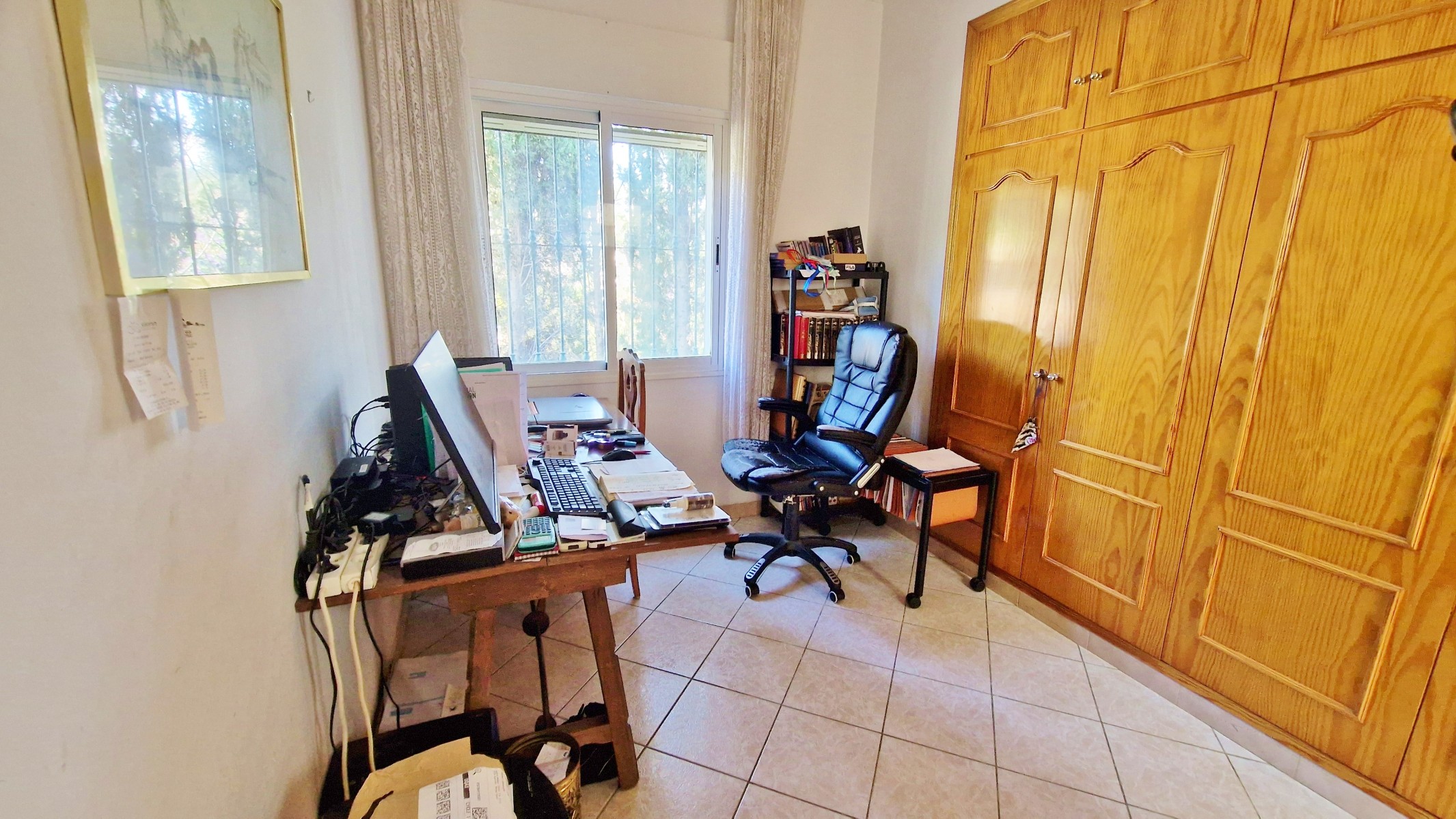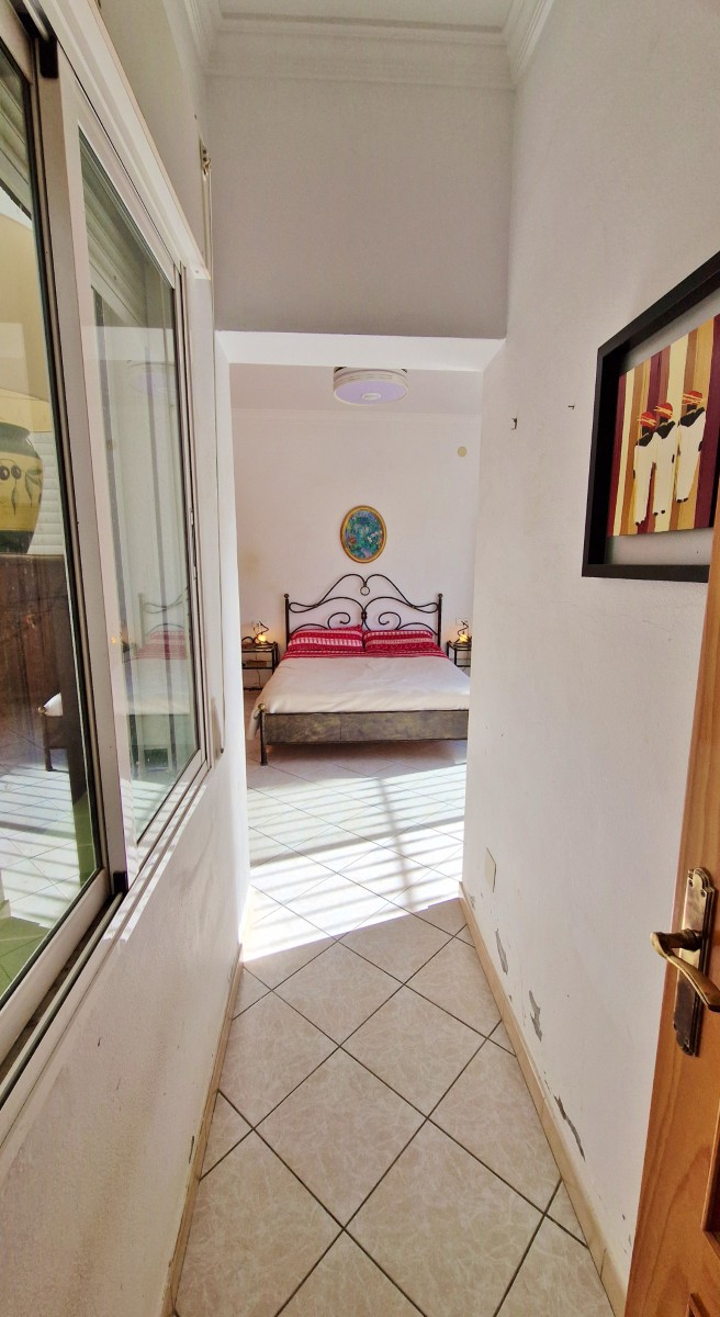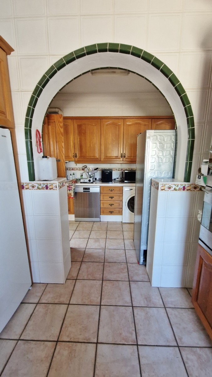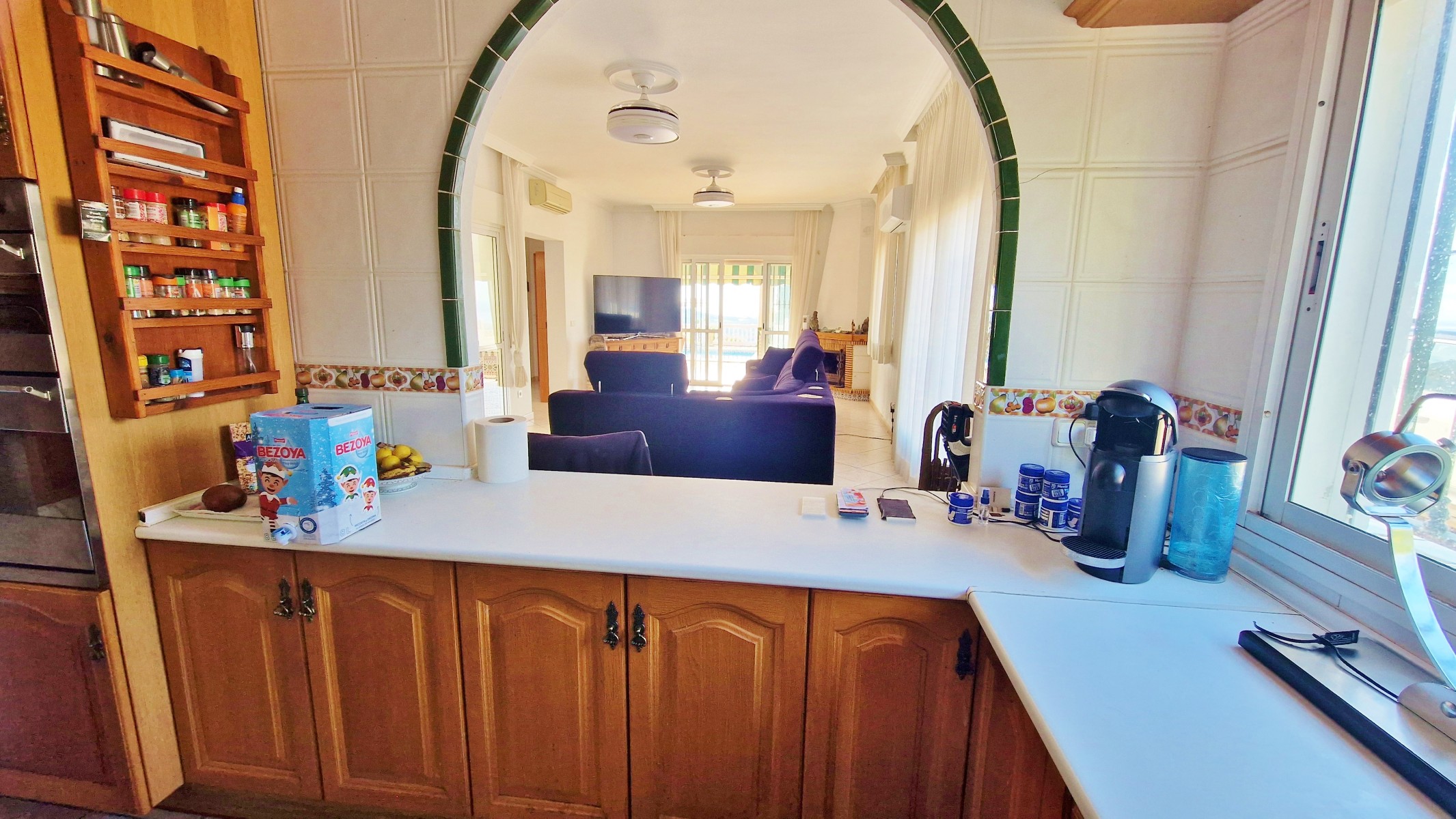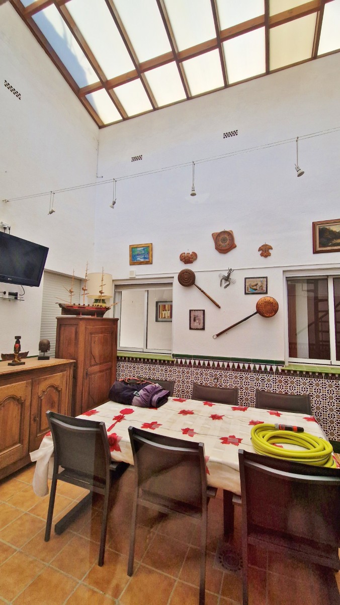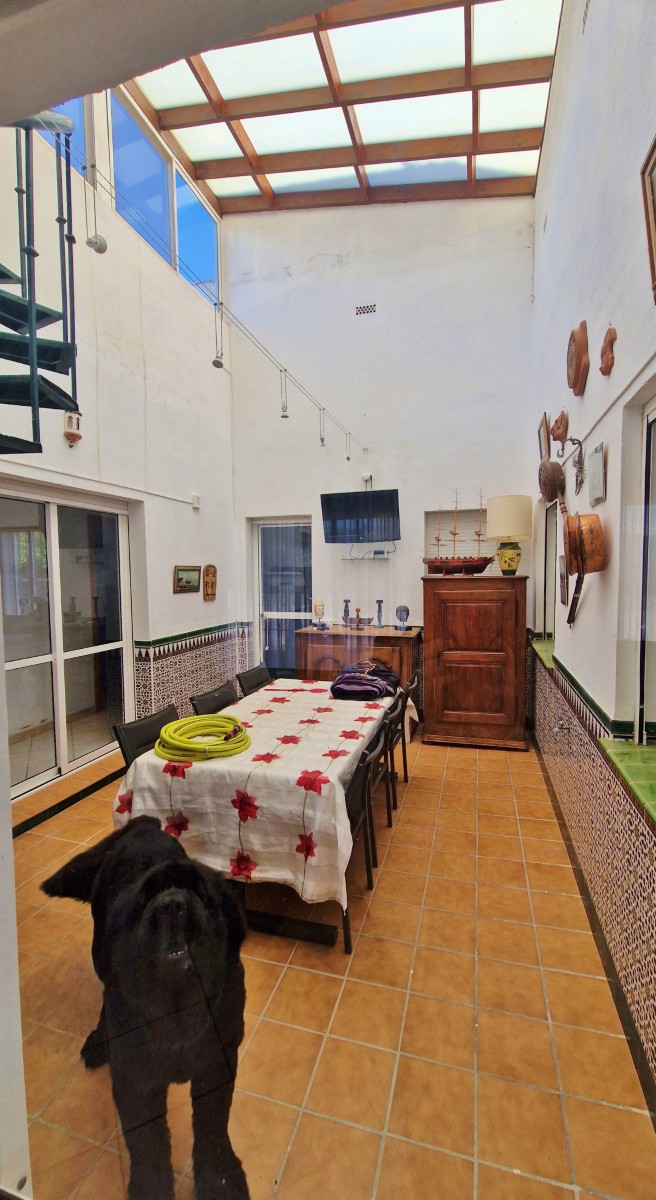 A gated entrance leads up a private driveway to a parking area to the West side of the house, and behind, on the north side too, with parking for at least 4 or 5 vehicles. The main house and pool are located on this level, elevated above the flat garden area, separating it perfectly from the lower grounds. To the front of the house, facing the pool is a covered terrace (around 2 x 10m) with arches, tile and pull-down awnings. The centre of this unusual house is taken up by an internal patio courtyard of around 5 x 4m, with windows all around, bringing in plenty of light from the centre of the house, as well as from the exterior windows of the house. Two doors, from the two opposite ends of the internal patio give access to its excellent space, used currently as a dining area. It could also be turned into an internal courtyard garden, with potted flowering plants, perhaps even a palm tree in the centre.