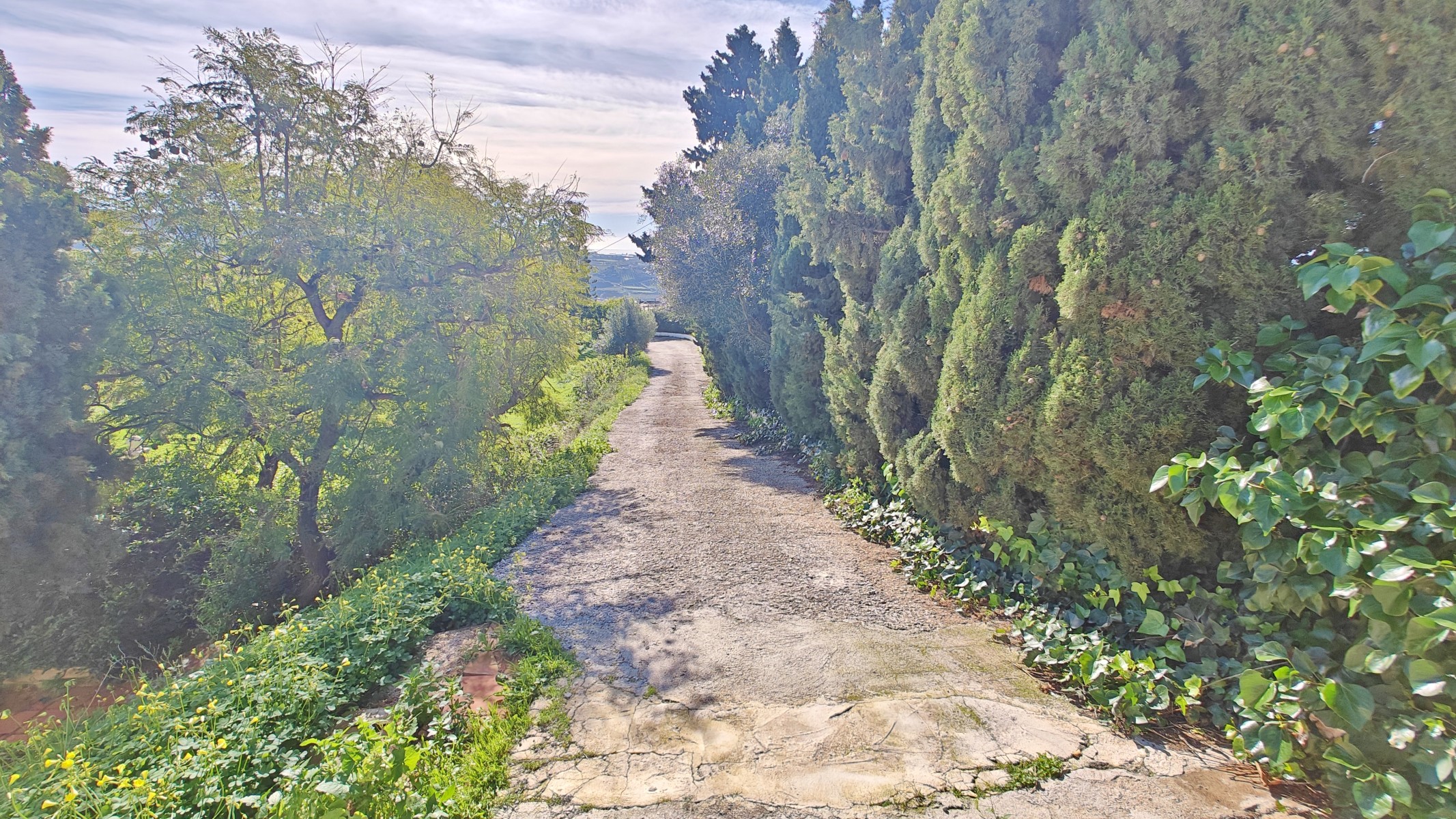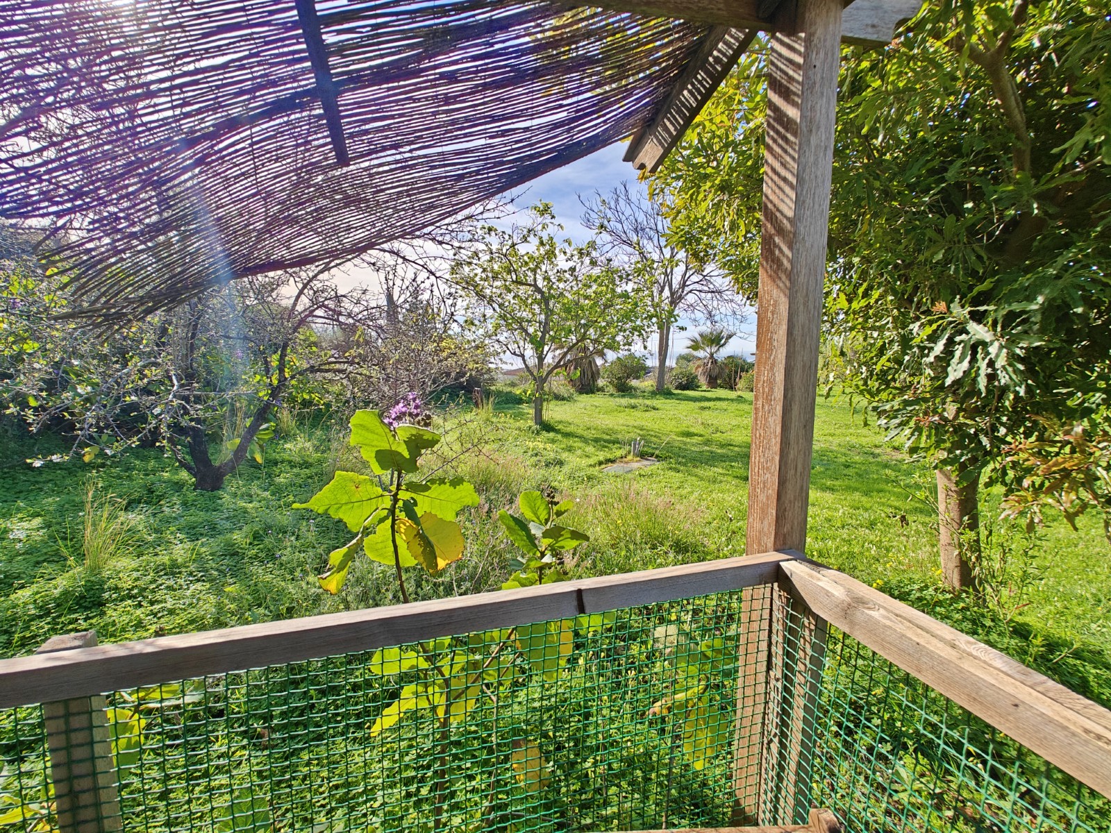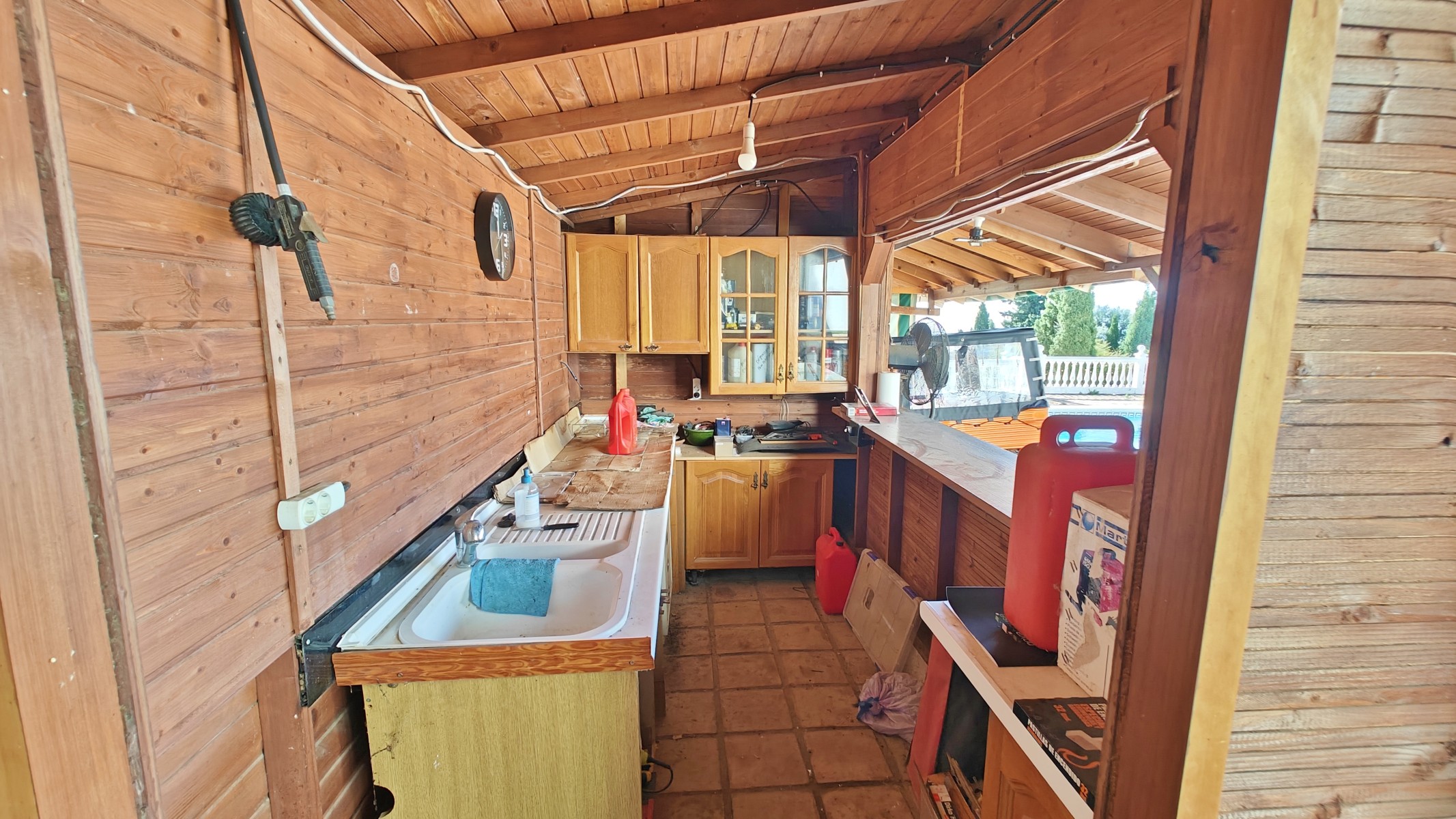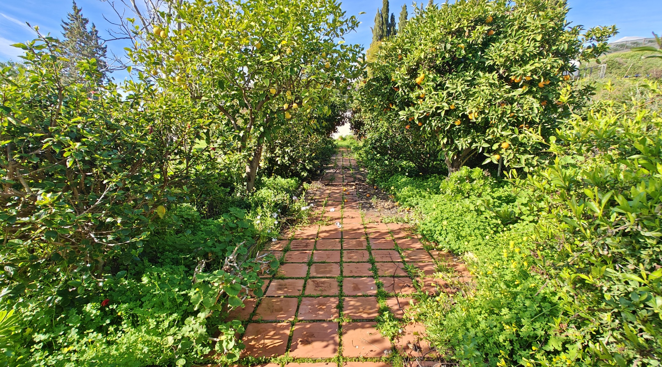 From the terrace, steps lead down to the grounds on the lower level, which are on flat land, laid to natural grass which grows in the springtime and dies down in the summer naturally. The whole area is planted with mature trees of many types, including many fruit trees and decorative trees. It is a delight to wander through the grounds, enjoying the peace, the views and the space. Set to one side are the two wooden chalets, accessed via a beautiful walkway lined with citrus fruit trees. Each chalt offers a guest ‘studio’ or large bedroom with a covered terrace. Both need some updating/repairing and one of them needs renovation, but as they are registered buildings, it is well worth updating and maintaining them. At present there is a shared bathroom accessed from outside (currently out of action). It would be easy to incorporate private bathrooms into each chalet.