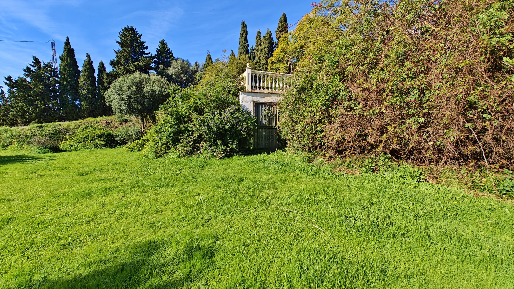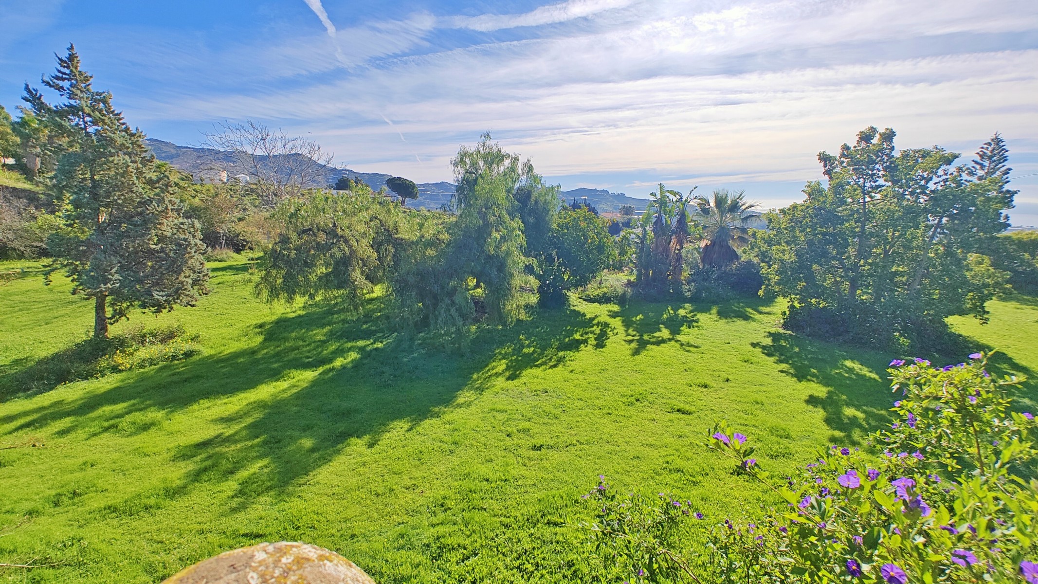 3 bedrooms – 2 bathrooms – separate WC – two huge adjoining storerooms – pool – two guest chalets in garden = 2 further bedrooms – extensive, flat gardens with many trees – 5000m2 plot – stunning, panoramic sea views – excellent access – 1.5km to the village – 5 Kms to the beach