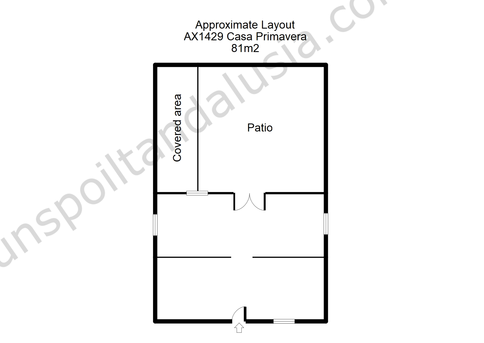 The front door leads into the house, consisting of two large areas with high ceilings. To the front, an area of 8 x 3m, (interior measurements) and the same to the rear (see floorplan). To the rear, double wooden doors lead out to the 40m2 courtyard patio, with covered animal area to the left (around 6 x 2m) and the remains of an old wood oven to the right.